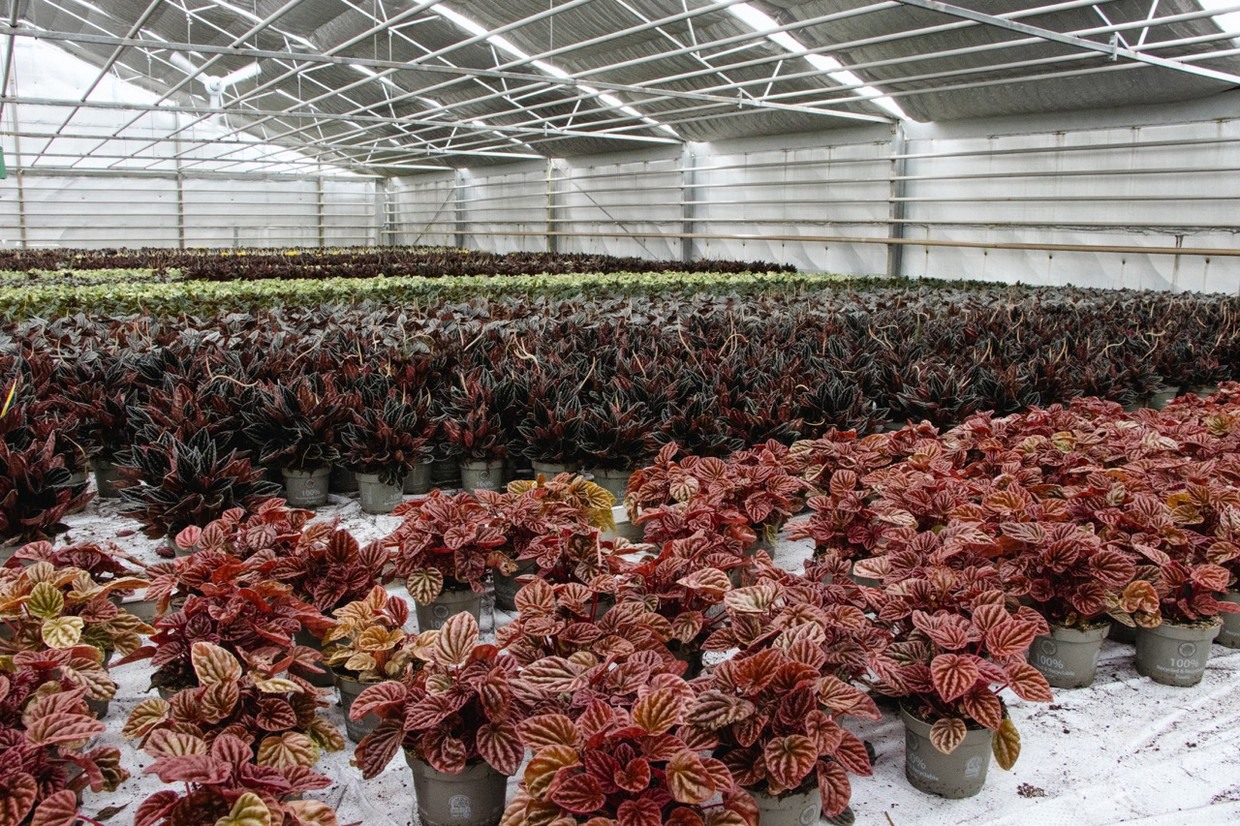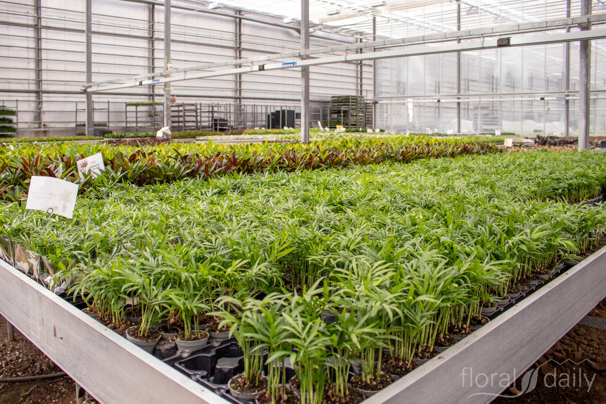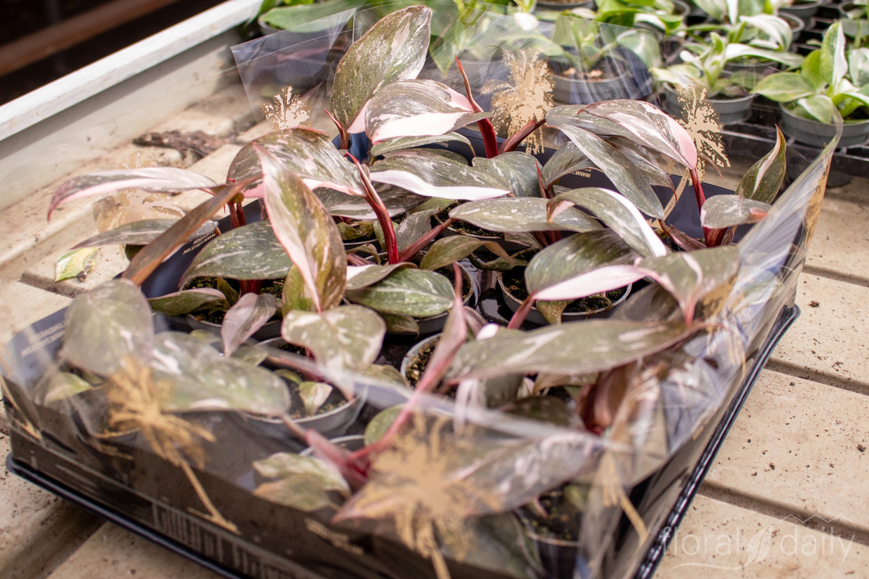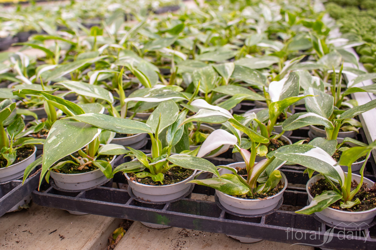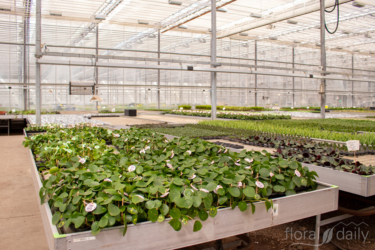 Ove Lundager in the greenhouse with Philodendron Pink Princess Marble (left) Philodendron Ring of Fire (right)