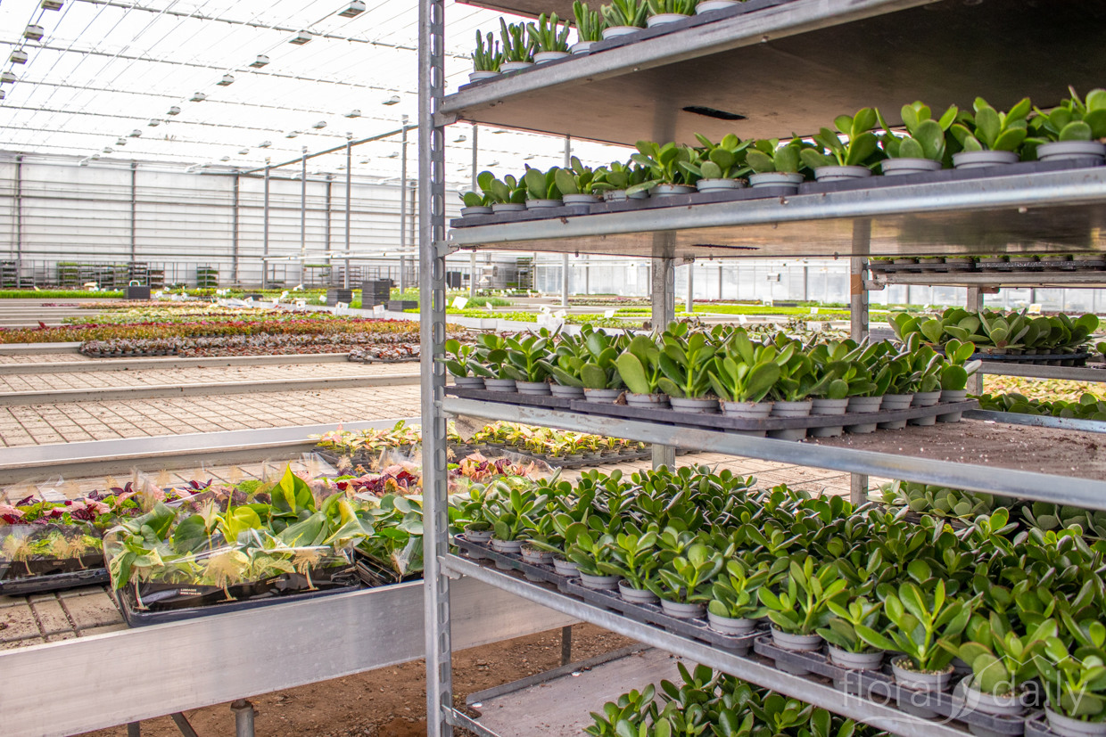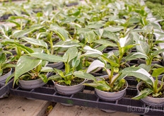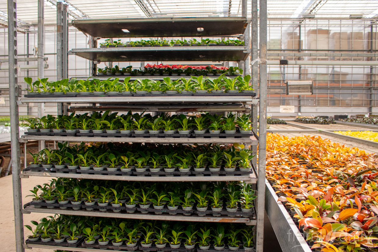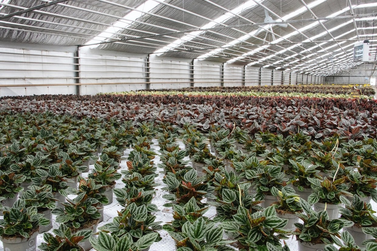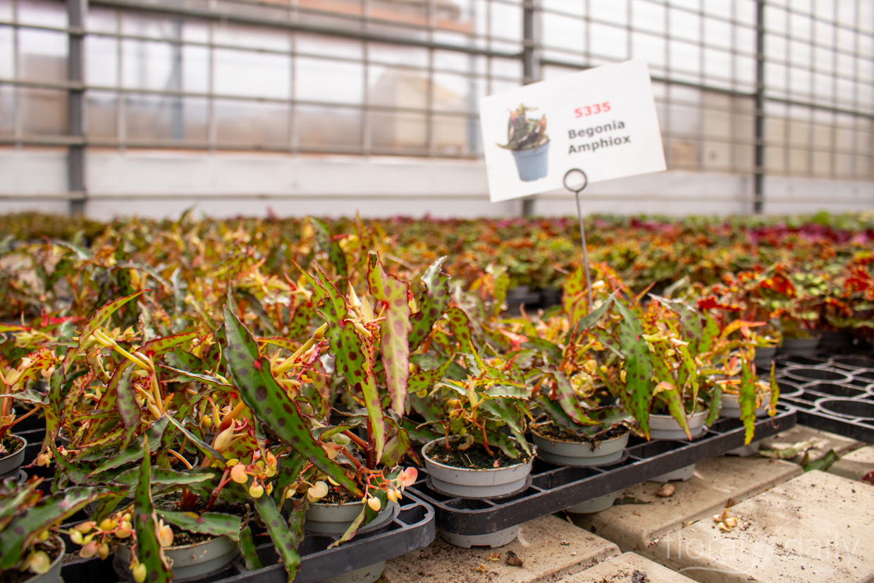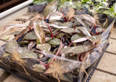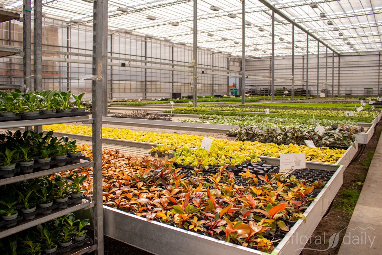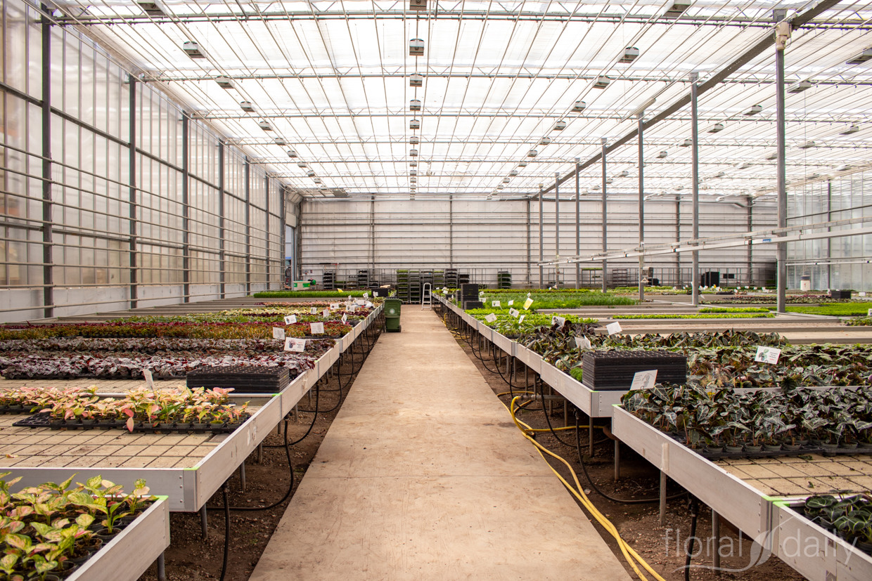 Ove Lundager in the greenhouse with Philodendron Pink Princess Marble (left) Philodendron Ring of Fire (right)