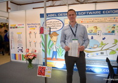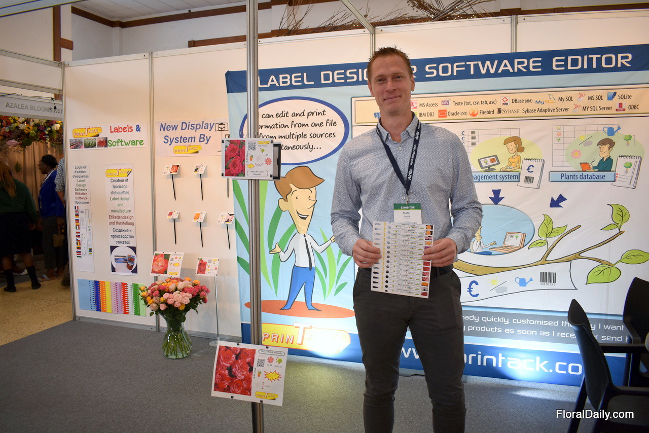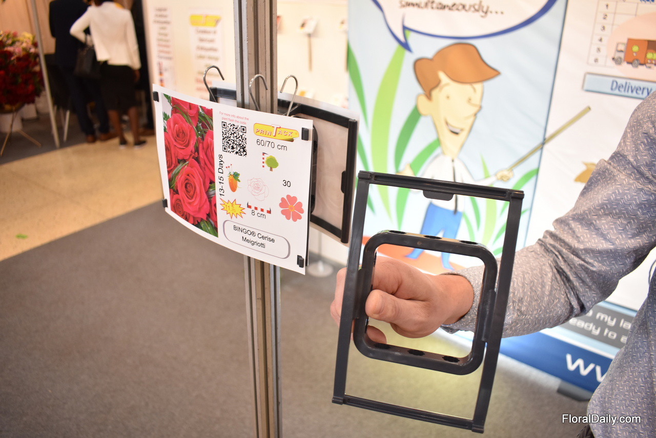 Matej Usenik of PrinTrack holding the loop label TF14, one of the us best selling products in Kenya for cut flowers. On the left you see a new system, windsafe system. See also the next picture. This system is used to hang the label, which are often in greenhouses and and on roles.
