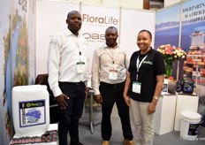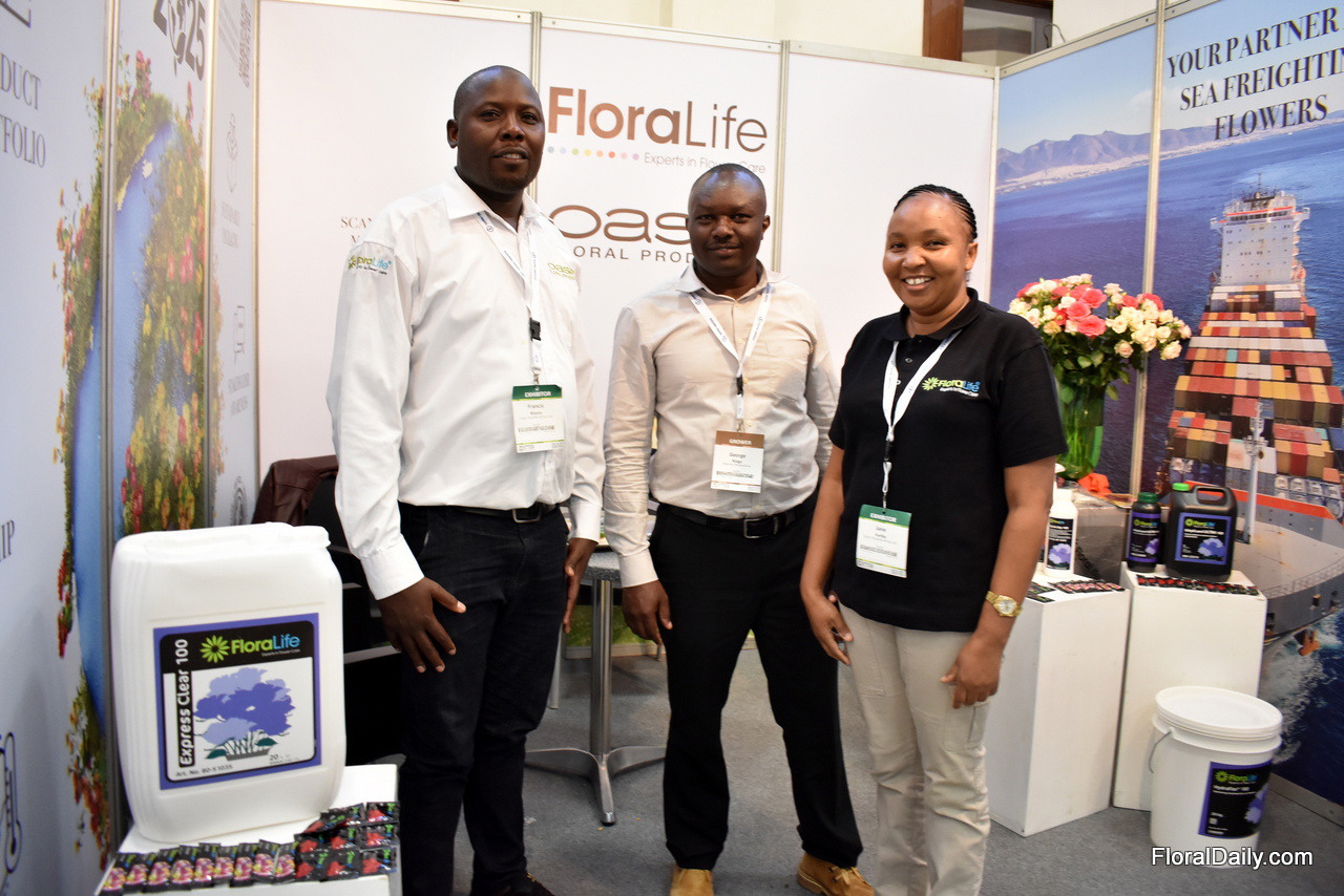 Francis Nteere and Jane Karina of Oasis Floralife with George Njogu of Equinox Horticulture in the middle. Left in the picture Express Clear 100, hydration product for mainly roses.