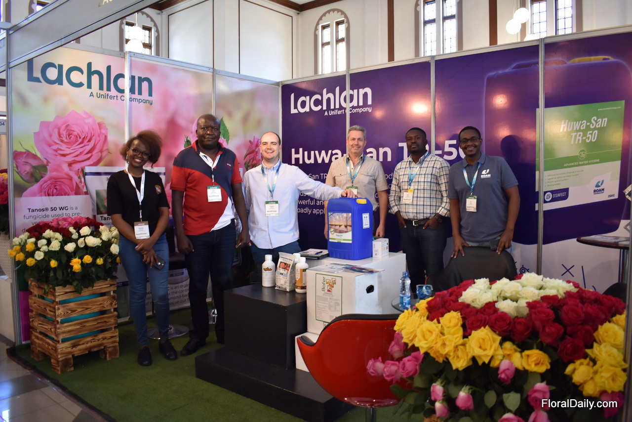 Salome Muchai of Credible Blooms, Jack Massawa of Lachlan, Fillipos Porstios and Ivan Casteels of Roam Tevhnology, Alvin Otieno, and Eric Njogu of Lachlan. Huwa-San is the highlight at the stand, distributed by Lachlan, and this a product of Roam Technology.
