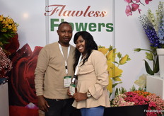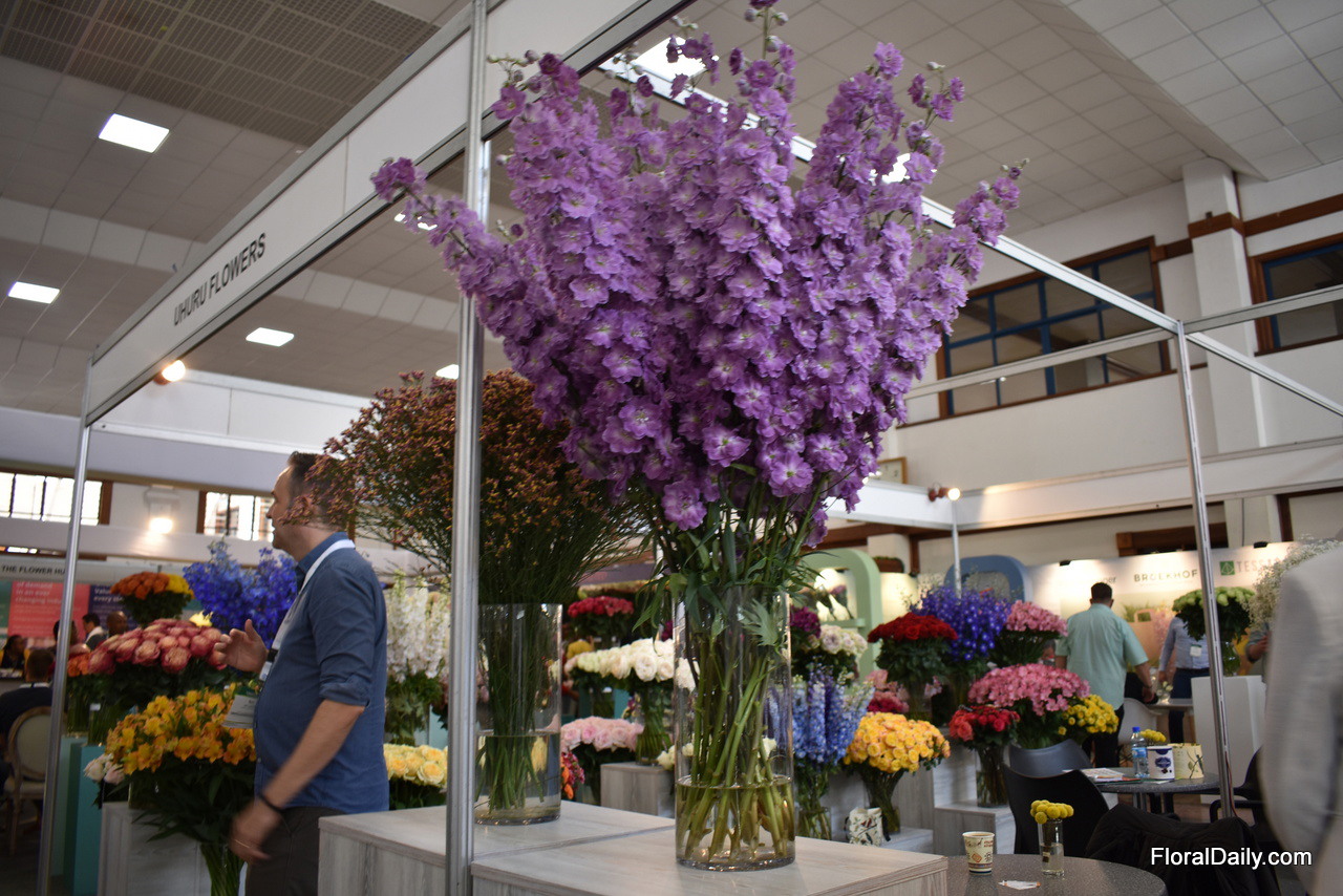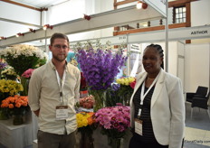 Cedric Saborowski and Beth Kuria from Blooming Africa next to their delphinium Purple Heart of the delphinium devotion series. They also grow limonium, hydrangea and satire in Gilgil, Kenya. Together with 8 farms, they are exhibiting at the Fresh Exchange stand.