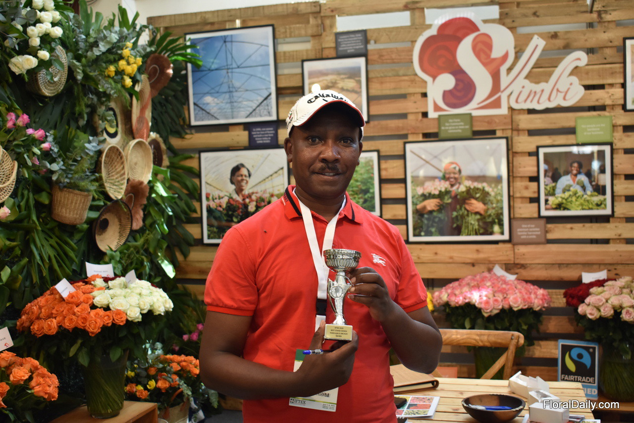 James Kanyari of Simbi Roses with their bronze award for best stand design in the perishables category. They grow roses in Thika.