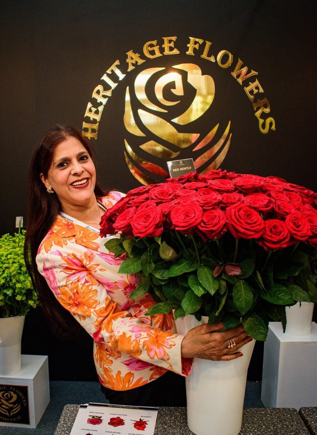 Ranjeeta Rai, the Director of Heritage Flowers Limited with Bentley Red, a new variety of Select Breeding.