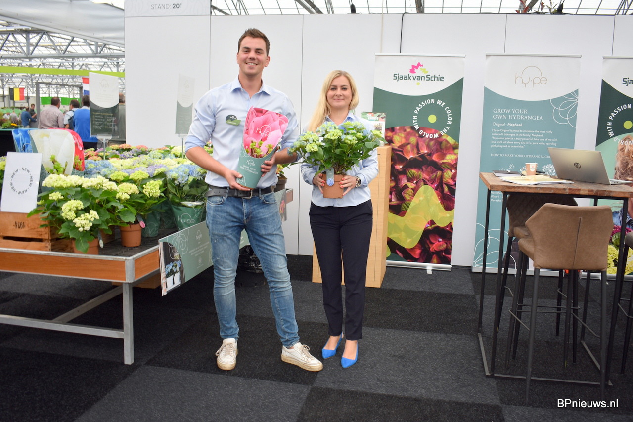 Sam Dubbeldam and Natalia Agneza of Sjaak van Schie. With the 'grow your own hydrangea' for garden centres and retail. A hydrangea that can be put down earlier or later in the season so that garden centres or retail can extend its season.