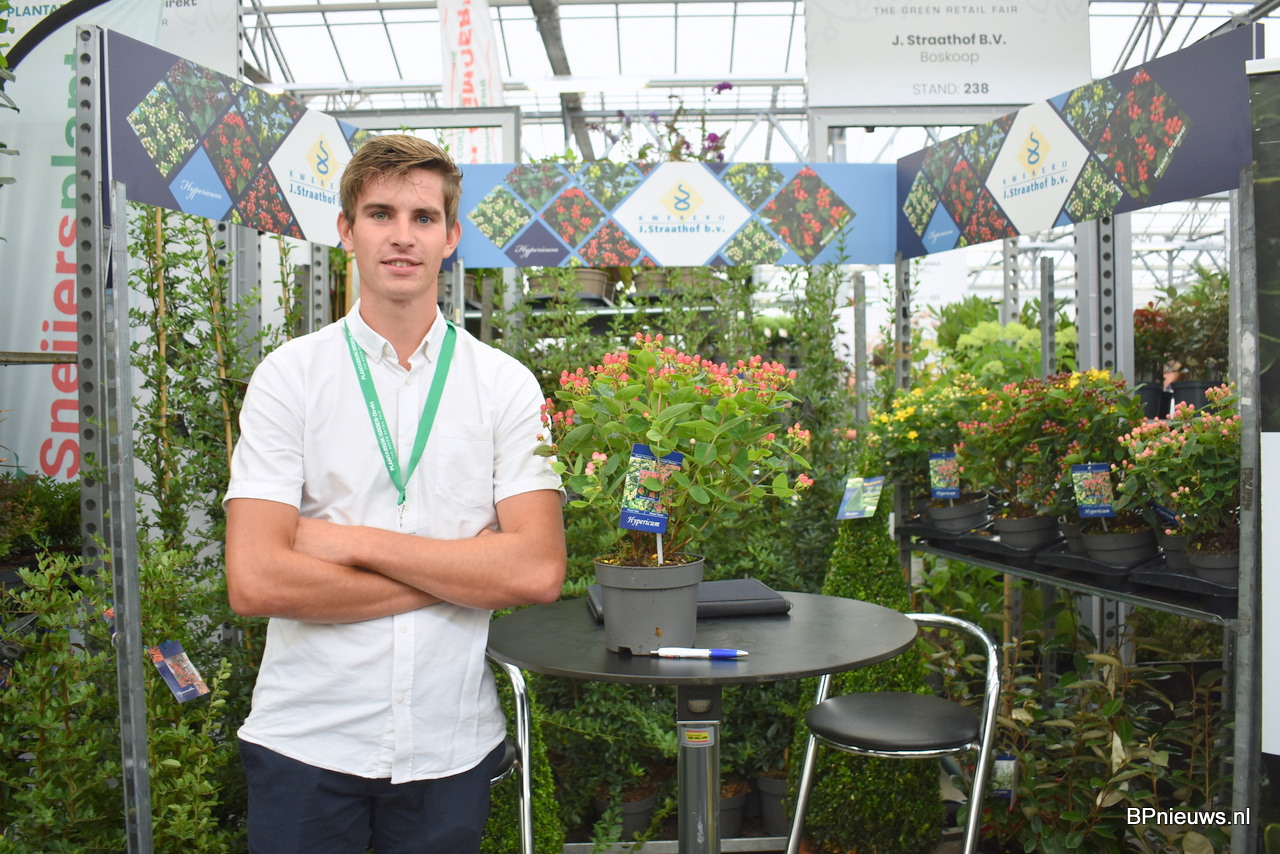 Roel Straathof of J. Straathof with the hypericum. They grow a lot of outdoor buxus and Ilex and in autumn hebe and these hypericums he is standing next to.