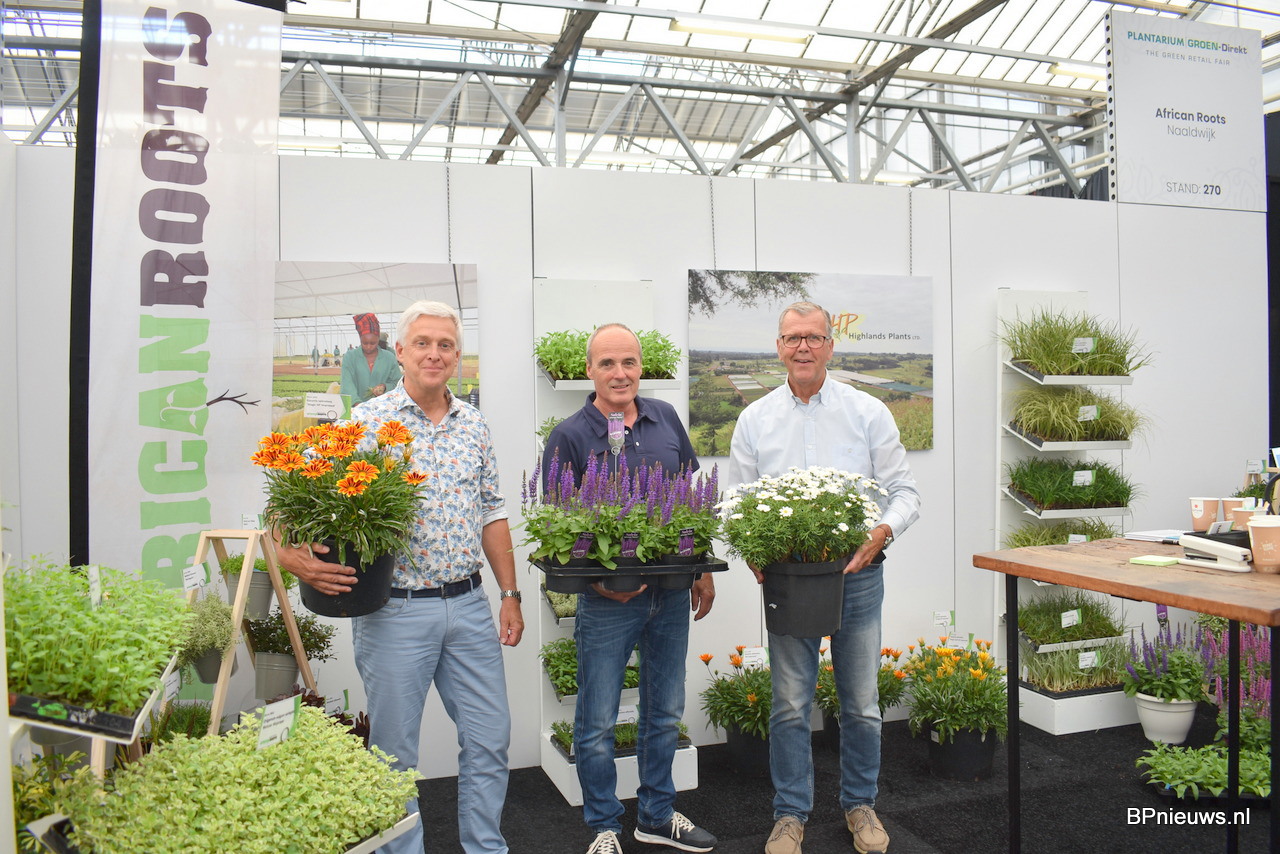 The men of African Roots, from left to right Paul Zwinkels, Rien van Hemert, and Hans Bentvelsen. Paul with one of their own selection Gazanias, Rien with, new to African Roots' selection, Salvia nemorosa Rianne Purple, and Hans with the Chrysanthemum white.