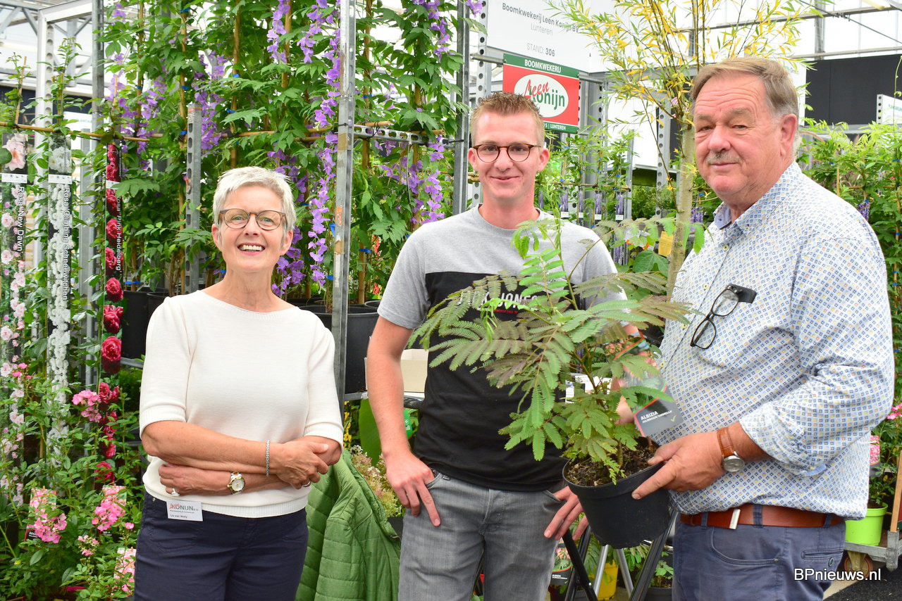 Lia van Wely, Jories Pater and Leen Konijn of Leen Konijn Nursery. Leen Konijn on the right with the Albizia. One of more 300 products grown at the nursery.