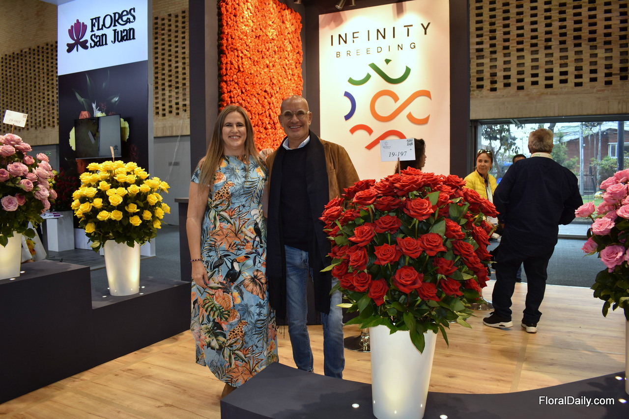 Ana Maria Quiñones of Infinity Breeding with Pieter Landman, next to a new red variety. “It is a pure red with a velvet layer. Even when in the supermarkt with neon light stays red. So, a true red. On top of that, it has a stem with hardly thorns.”2024 will be available for the growers. “It is variety for bouquets As it fills the bouquet very nicely.”