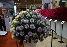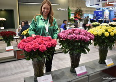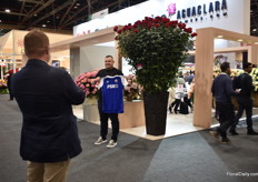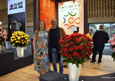 Ana Maria Quiñones of Infinity Breeding with Pieter Landman, next to a new red variety. “It is a pure red with a velvet layer. Even when in the supermarkt with neon light stays red. So, a true red. On top of that, it has a stem with hardly thorns.”2024 will be available for the growers. “It is  variety for bouquets As it fills the bouquet very nicely.”