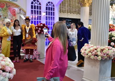 Pieter Landman (in the middle), together with Ada Van der Wereld and Roos van Leyenhorst of Elite Flower, known as the largest floral organization in the world. Pieter, Directeur business development at the company, designed this booth in includes over 30,000 stems are used Ada and Roos helped to realize this design. The Veggie (see the green rose) was one of the highlights at the booth. Special about this variety? Landman: “Vaselife and the color. Green is a neutral color but at the same time pops out in arrangements.”