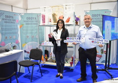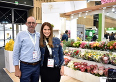 Alejandra Fernandez and Bas Pellenaars of Dümmen Orange Latam with part if the new varieties, like the full barberatos series that they are presenting at show.