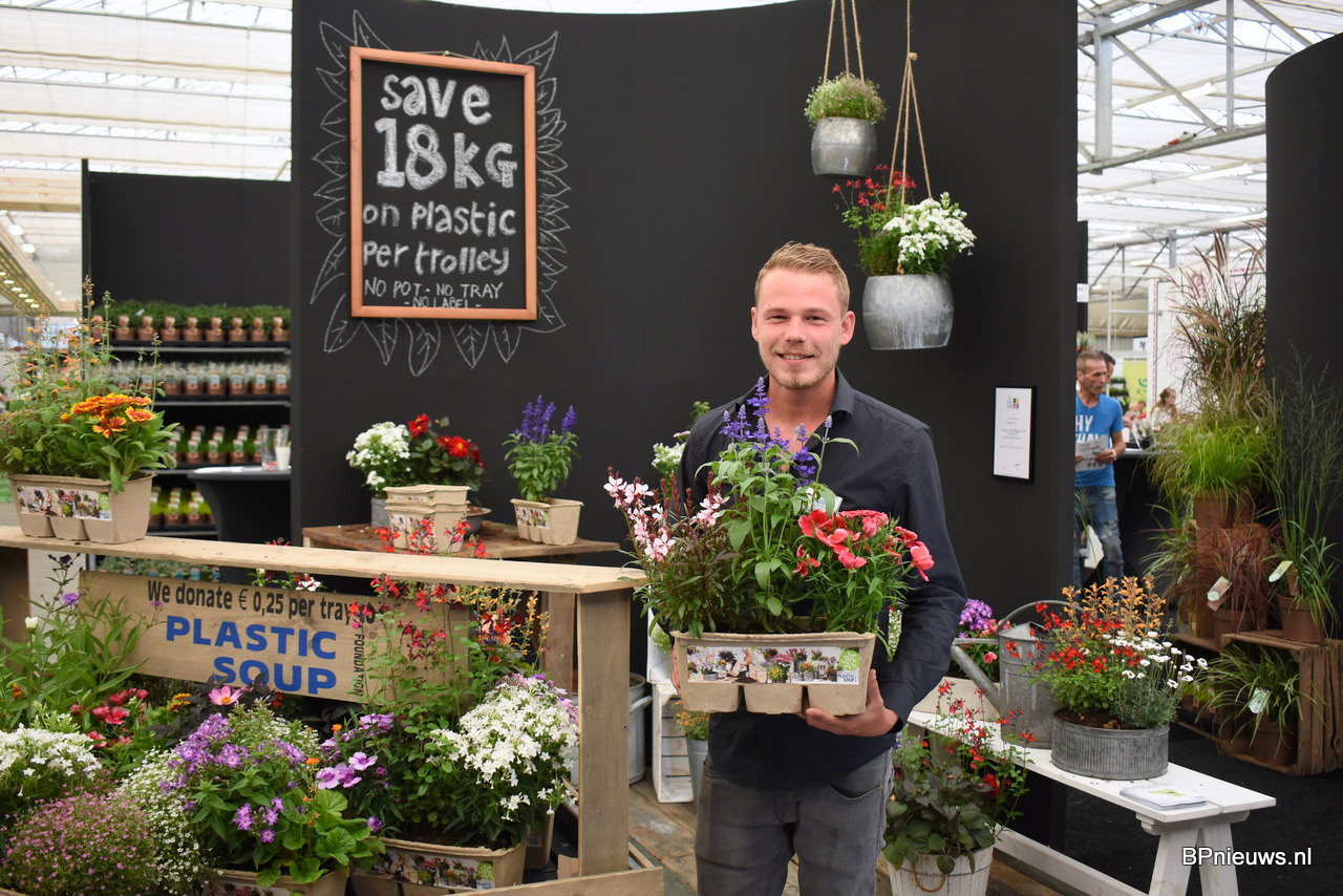 Tim Dessing from Colour Your Garden holding his Zero Plastic Tray that will save 18 kilo plastic per trolley.