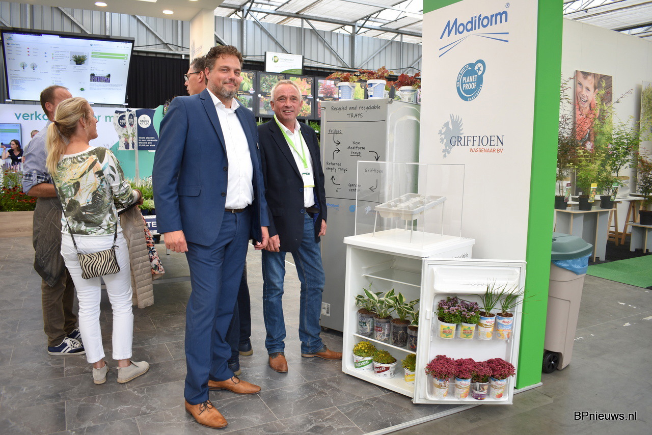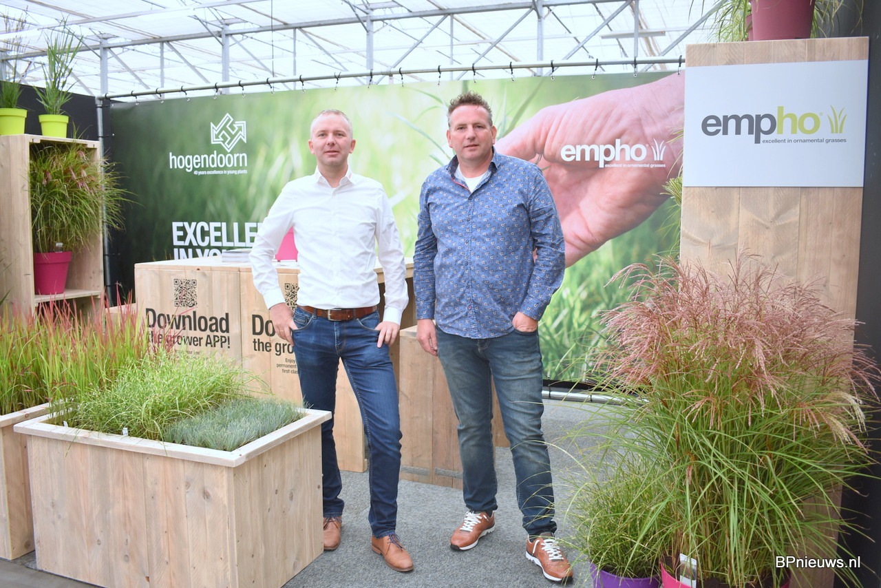Marco Wesselink of Hoogendoorn and Piet Bron of Empho. Hoogendoorn, a wholesaler of young plants and ornamental grases supplies the ornamental grases of Empho in countries abroad the Nehterlands. At Plantarium, they introduced the pink sister of Miscanthus Red Cloud (rechts onder het empho logo). Red Cloud won the first price at the Oaks in the UK.