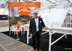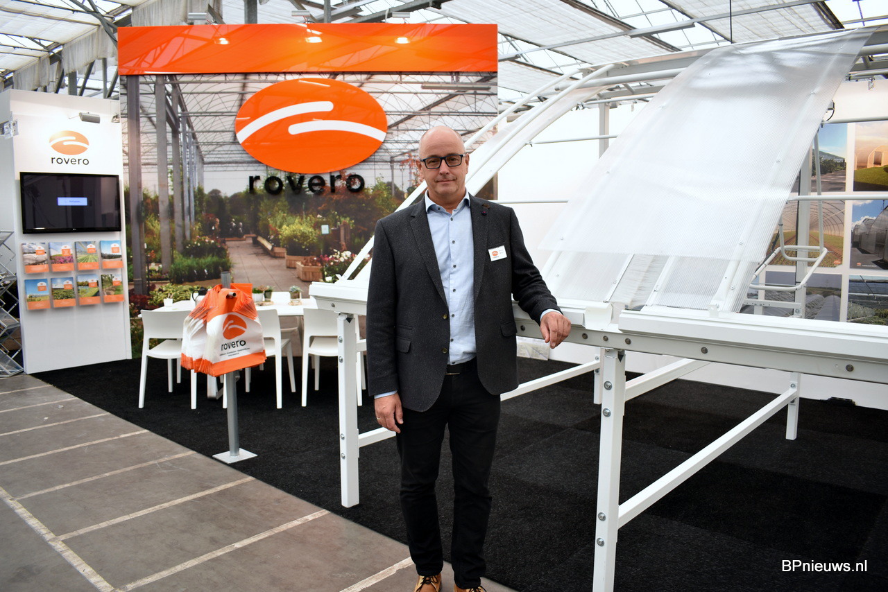 Jan van Hemert of Rovero next to one of their poly greenhouses, especially made for the treenursery industry because the roof can open fully.