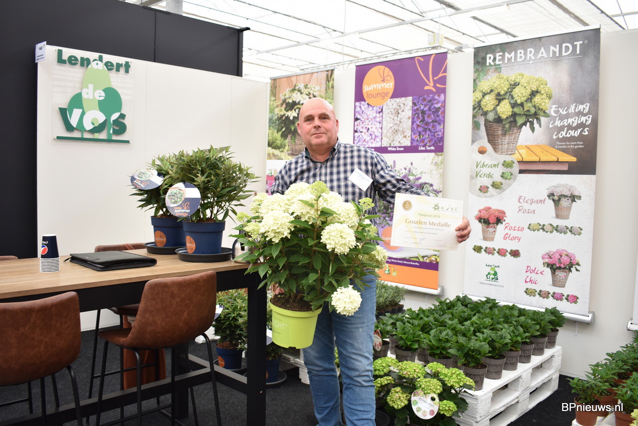 Lendert de Vos of Lendert de Vos with the Hydrangea paniculata ‘HYLV02 (Whitelight), one of the two varieties that were, next to Little Lemons, crowned with the golden award. Also Buddleja ‘SRPBUD989’ (Blue Sarah) of Lendert de Vos received a Golden Medal. In Reewijk, the Netherlands, the plants are bred and grown.