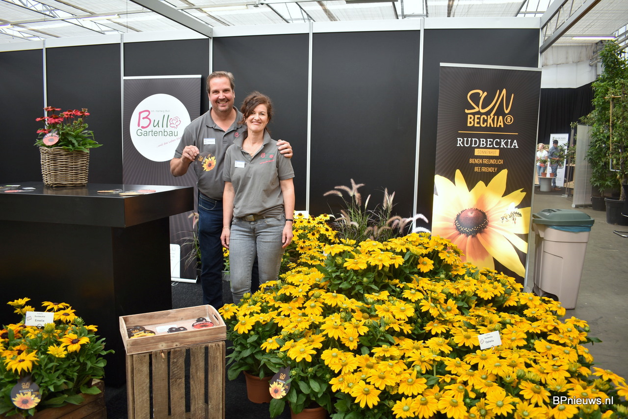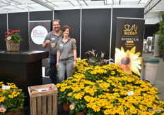 Haftwig en Ulrike Bull oif Bull Gartenbau next to the Sunbeckia, their own bred variety. In the north of Hamburg, they grow and breed several plants in a 2.5 greenhouse. For the first time, they present them at Plantarium.