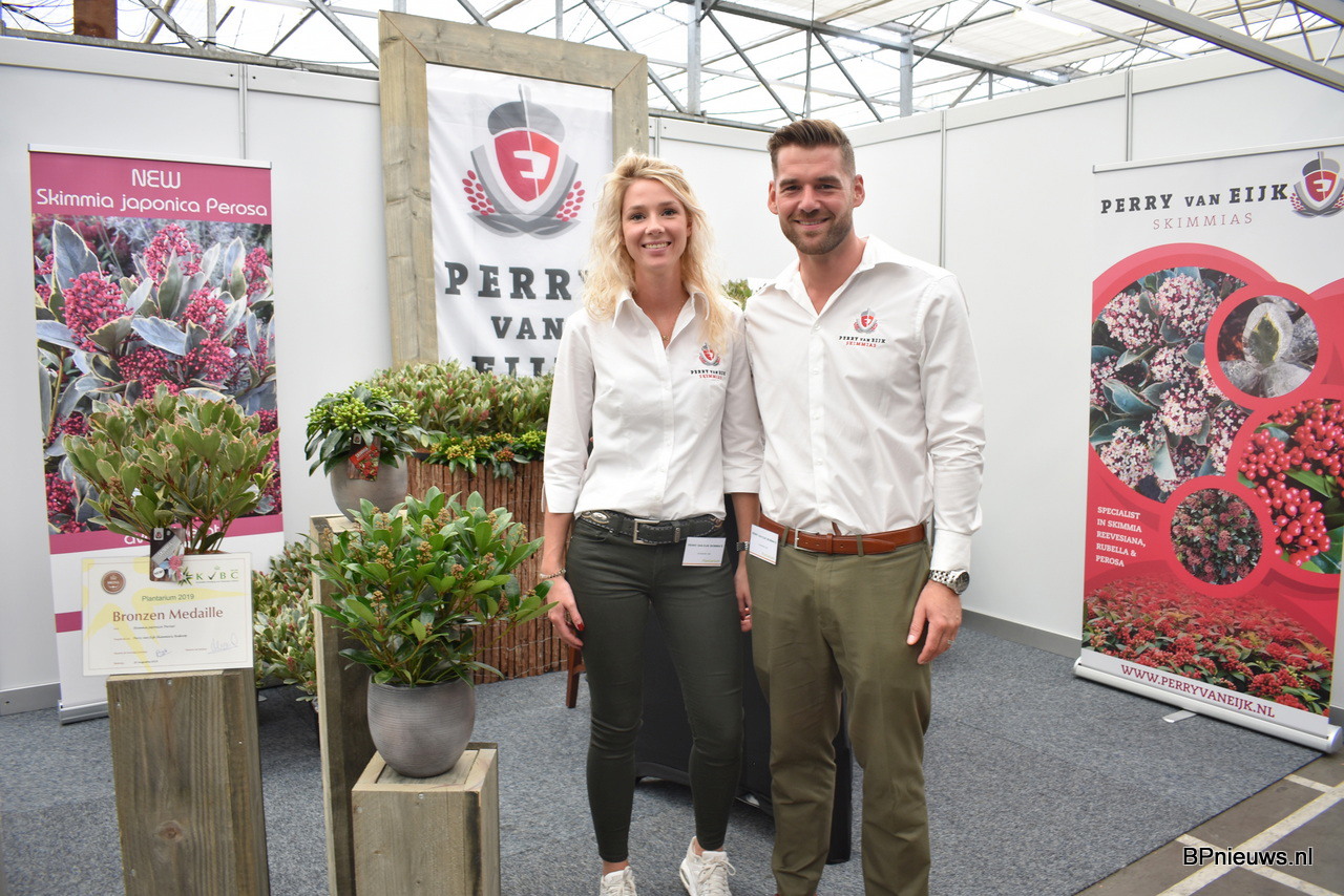 Amber van Zonneveld and Perry van Eijk of Perry van Eijk Skimmias. Since January 1st, he succeeded the company from his father. At the show, he puts the spotlight on the new variety Skimmia Japonica Perosa, a sport out of Skimmia Rubella-familie.