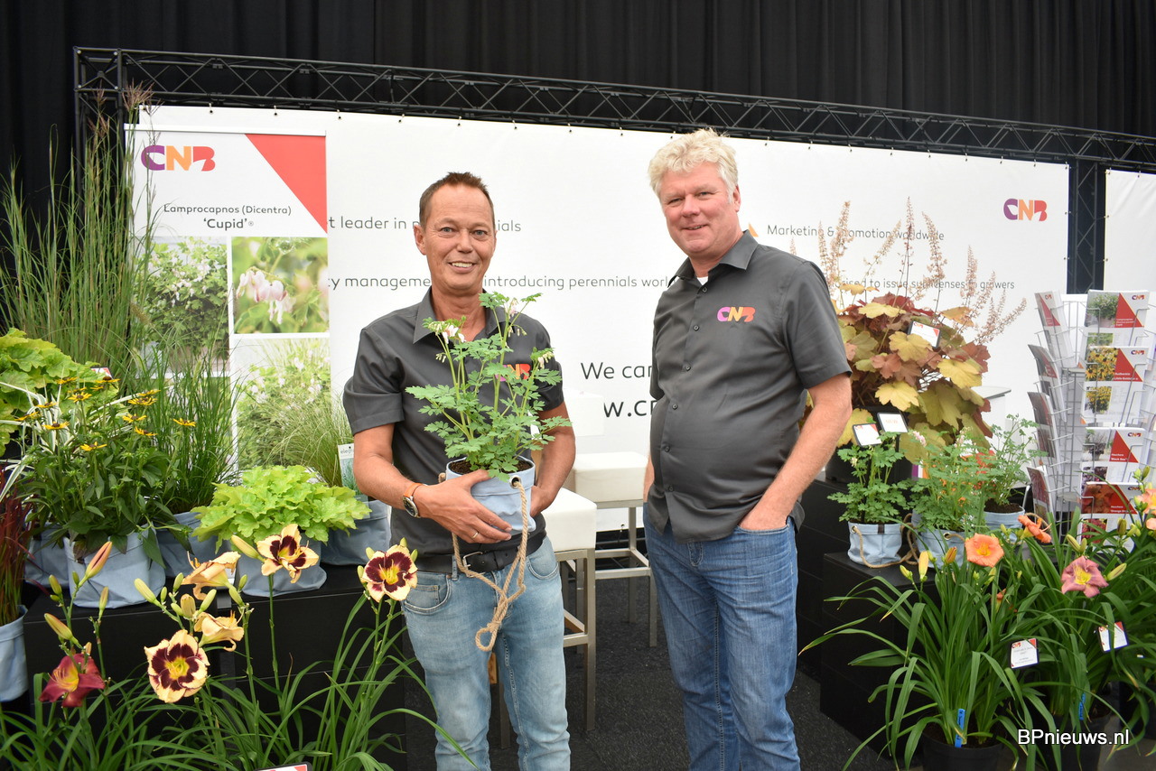 Henk de Jong and René Schrama of CNB presenting the new Lamprocapnos (Dicentra) spectabilis 'Cupid'.