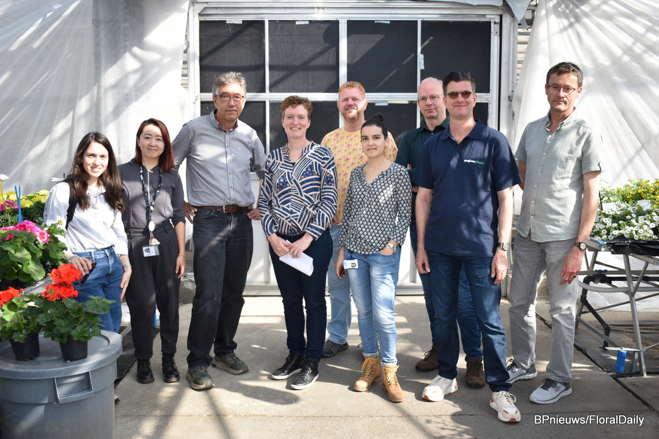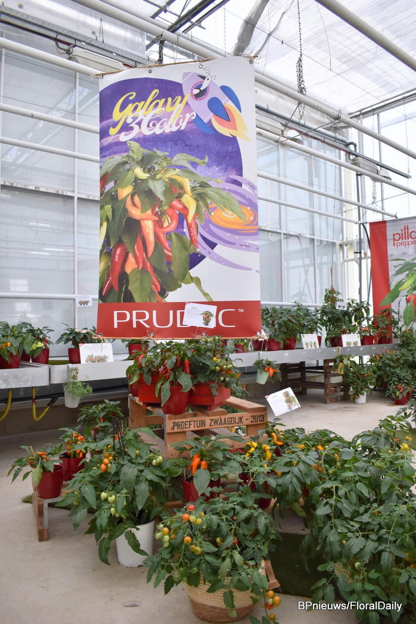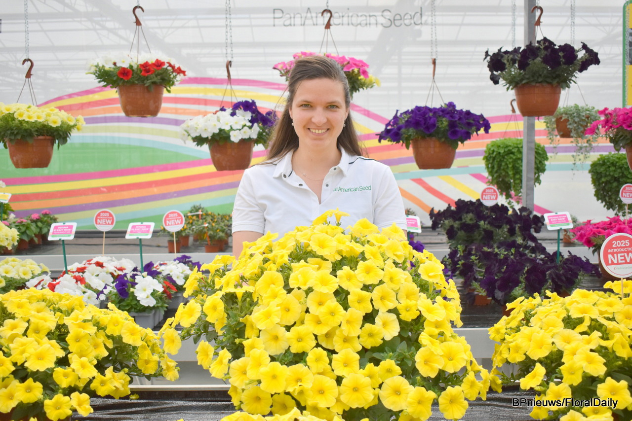 Eva Wijnker – Van der Cruijsen, Marketing Manager Europe at PanAmerican, with the new Petchoa Caliburst Yellow. The variety can withstand some cold in production and is relatively early, at a day length of 9.5 hours. The colors that the new Petchoa produces are not available in Petunias. "The best of Petunia and Calibrachoa in one."