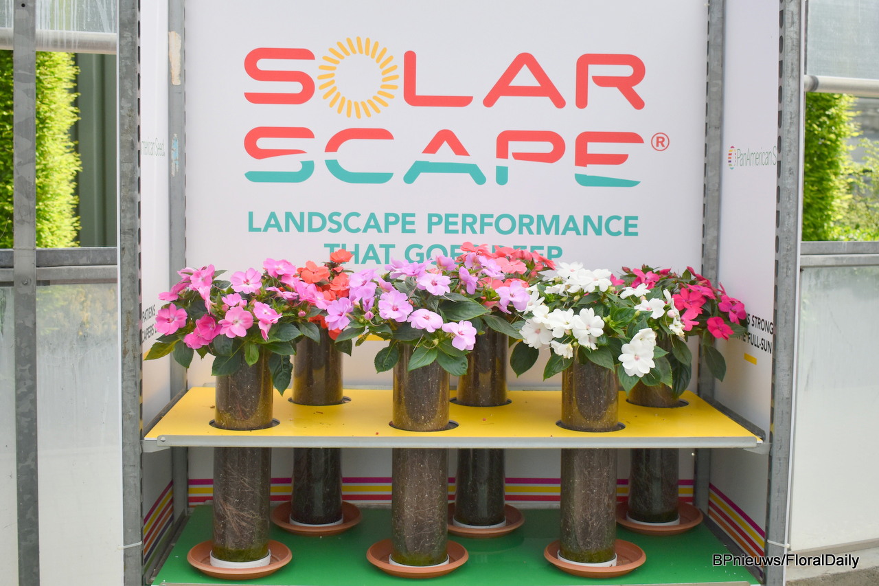 The Solar Scape is the first interspecific impatiens from seed. It is non-branded and there are no royalties or marketing costs to be paid. The variety is very heat resistant and has, as can be seen through the glass tubes, very good rooting. Should they get thirsty, they have a good bounce back with a sip of water.