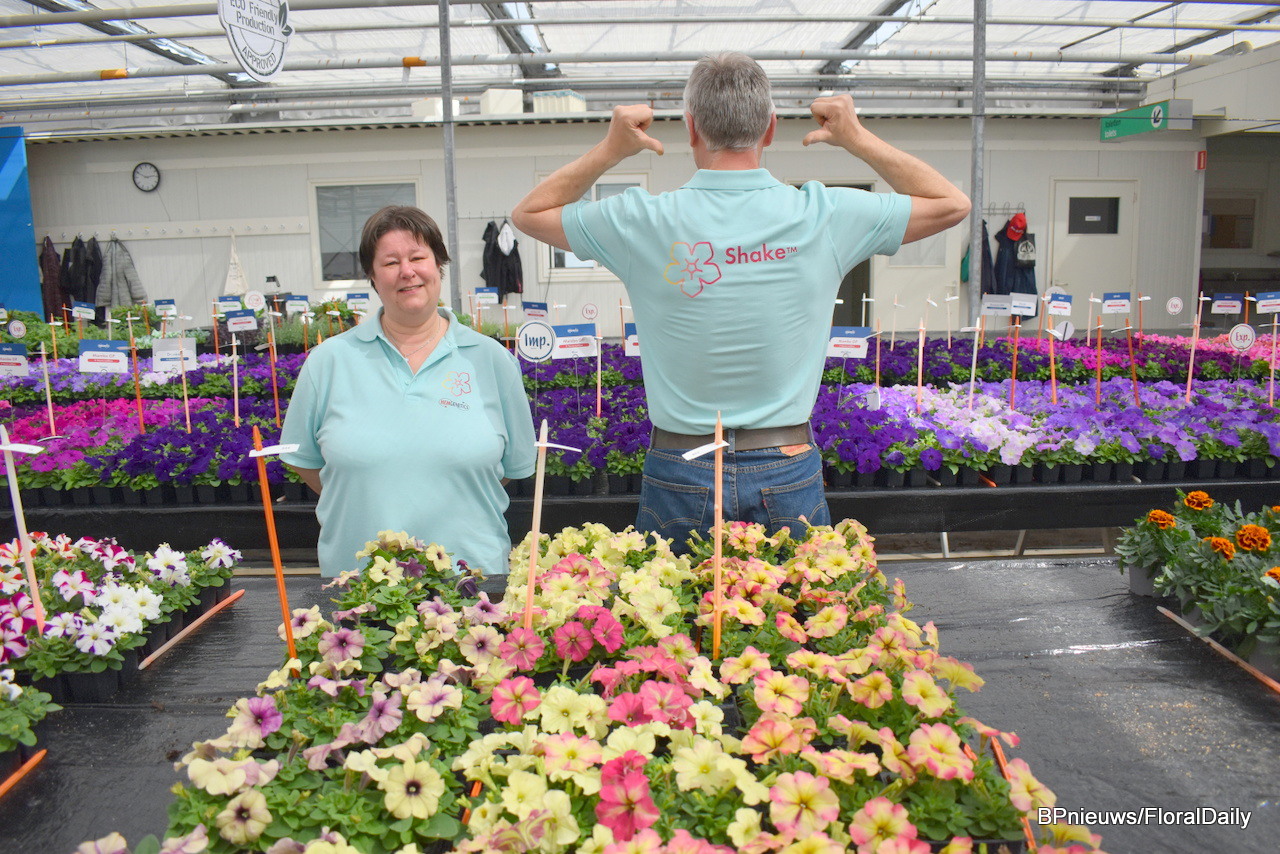 Carola Mantel – van Rijnsoever and René Knijn from Hem Genetics at the Shake. The new hybrid Petunia produces a sea of differently colored flowers. It is a compact variety, naturally from seed, and no retardants are needed because it has been bred to ensure the plant remains nicely compact.
