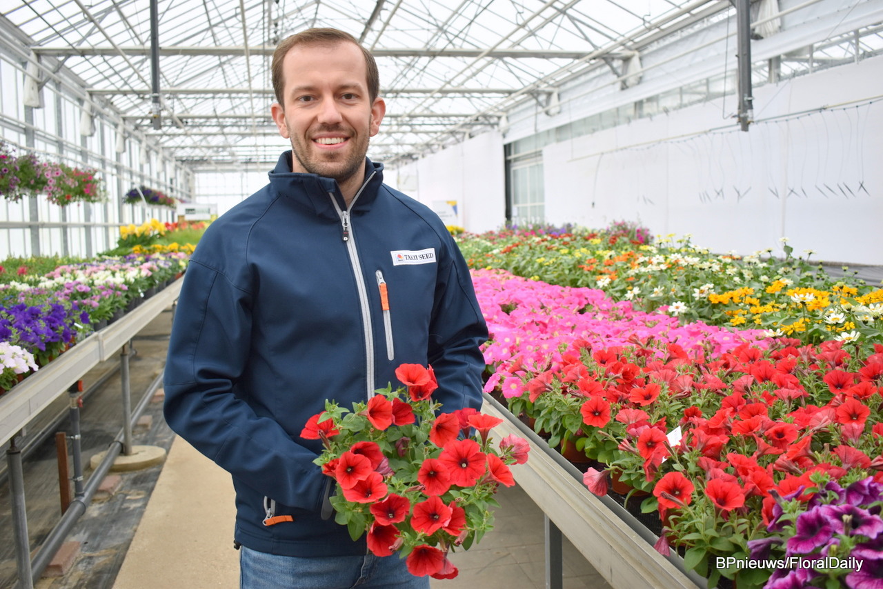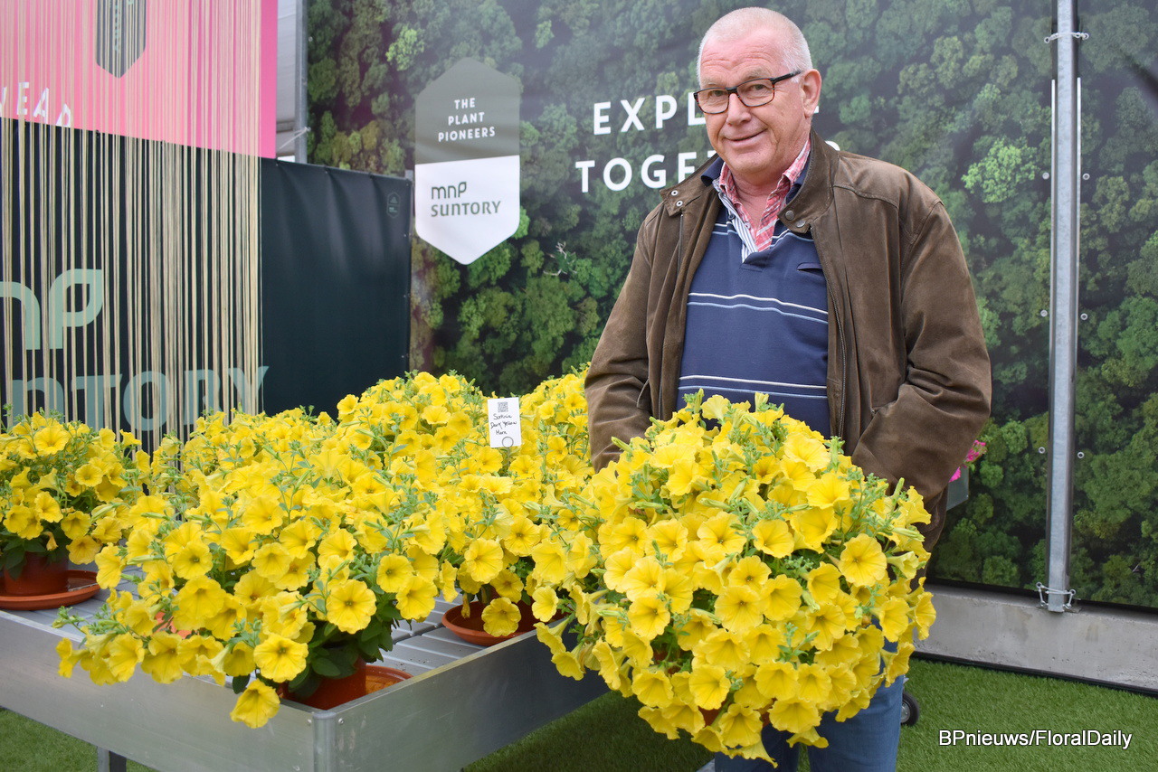 Klaas Droog, sales and license manager at MNP Flowers, from MNP Flowers, with the Surfinia Dark Yellow Morn.