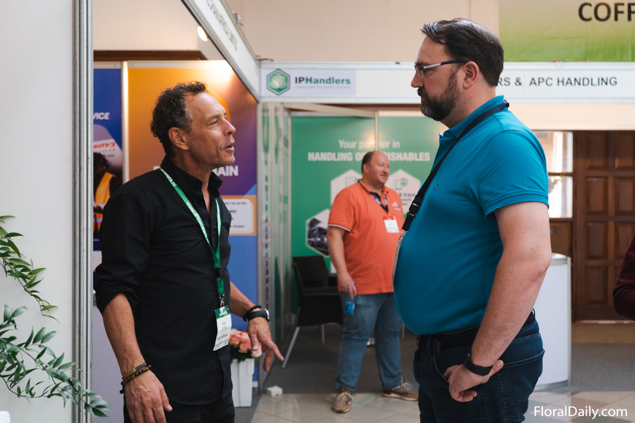 Richard Maijenberg from Horti supplies international visits the booth of Dimitrios Milios who’s with Plastika.