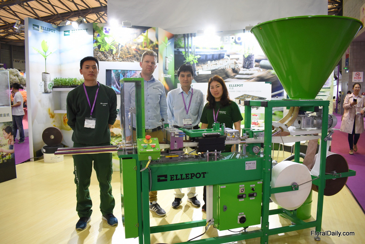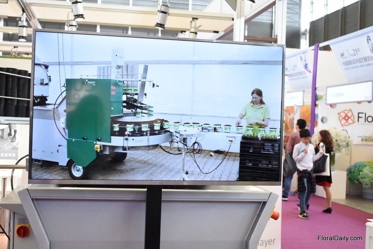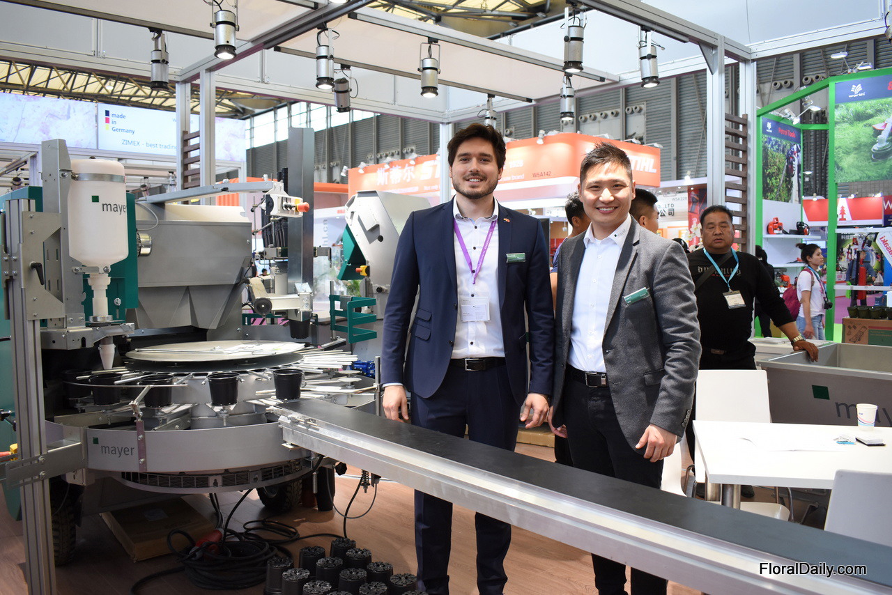 Manuel Linke and Lun Li presenting the potfiller TM 1010F, one of the three machines they are presenting at the exhibition. Last year, they opened their own sales office with technical support in Nanjing . According to Manuel, for the Chinese growers, it is now time to think about automatic solutions. "In several areas of the country, lobar costs are rising, so automatic processes becomes more interesting. The TM 1010F is interesting for the Chinese grower as many parts that are now being done manually are automated. It prepares the pots so that the young plants can be put in manually. The only manual labor is putting in the young plants. It can processes 4,000 pots per hour."