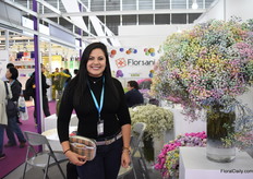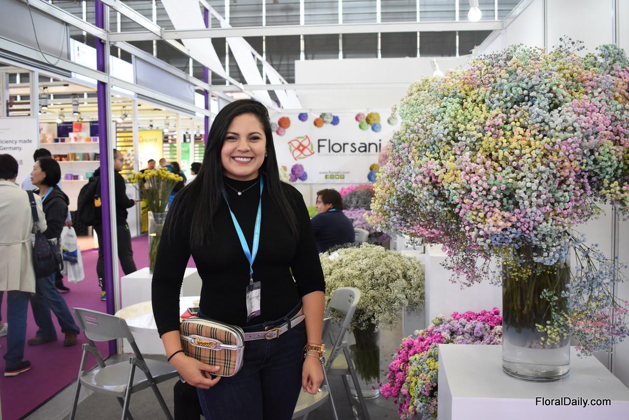 Belen García of Florsani next to their tinted Rainbow gypsophila. There is a lot of interest for this product. Four years ago, Florsani started to export 1 box from their farm in Ecuador to China and it is now one of their most important markets.