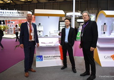 Ton ten Haaf of Dutch Lightning (left) and Paul van Raak (right) of P.L. Lightning Systems with a visitor of the show. They and more partners (P.L. Light Systems Gavita International b.v. Dutch Lighting Innovations LEDVANCE GSNL Agrolux) are represented in the booth Lightning Group. Together they are eager to develop the modern greenhouse industry for China.