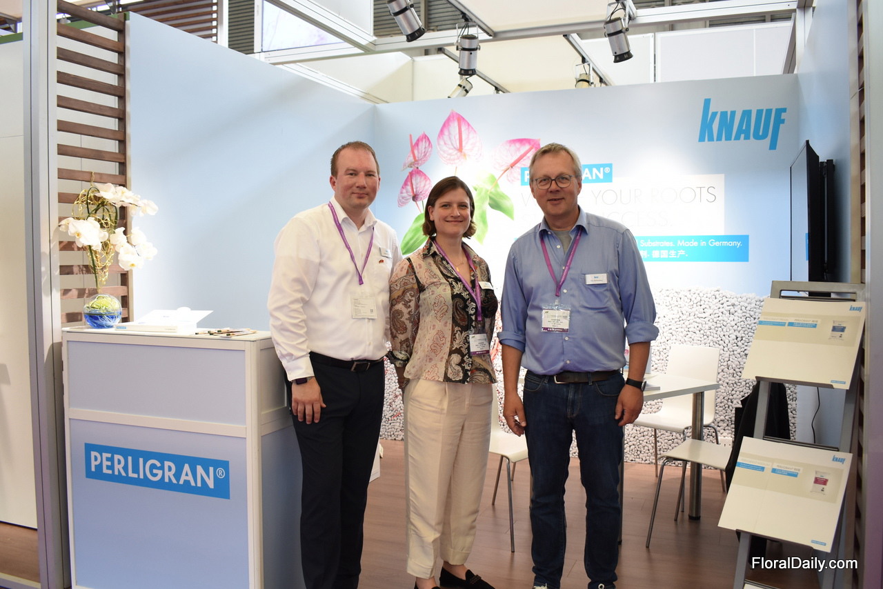 Christian Schröder and Dirk Mühlenweg of Knauf with Anouk Sijmonsma of PMA. According to Dirk, it is a challenging market as perlite is cheaper than peat moss. What makes them different from the local produced perlite is that their quality is always the same. "We take out the dust and use it for gypsum wall." All over the world, they see an increase in demand for perlite.