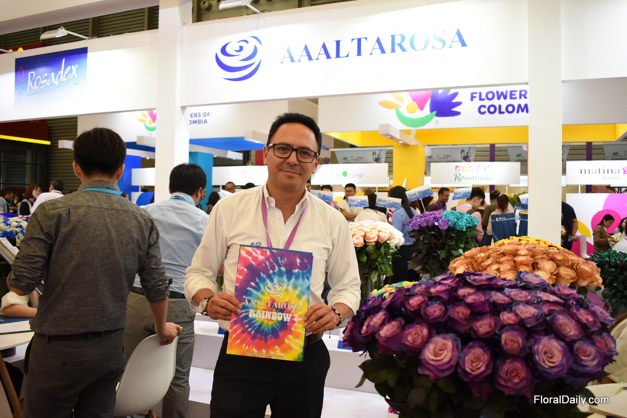 Ricardo Canelos presenting the AALTAROSA line, which consists of painted, dyed and "speaking roses" (roses with a logo). Three years ago, at the time they also started to tint their roses, they started exporting to China and they are growing slowly and steadily.  "Tinting of the roses was key to enter the market." Later, in 2018, they started to paint the flowers.