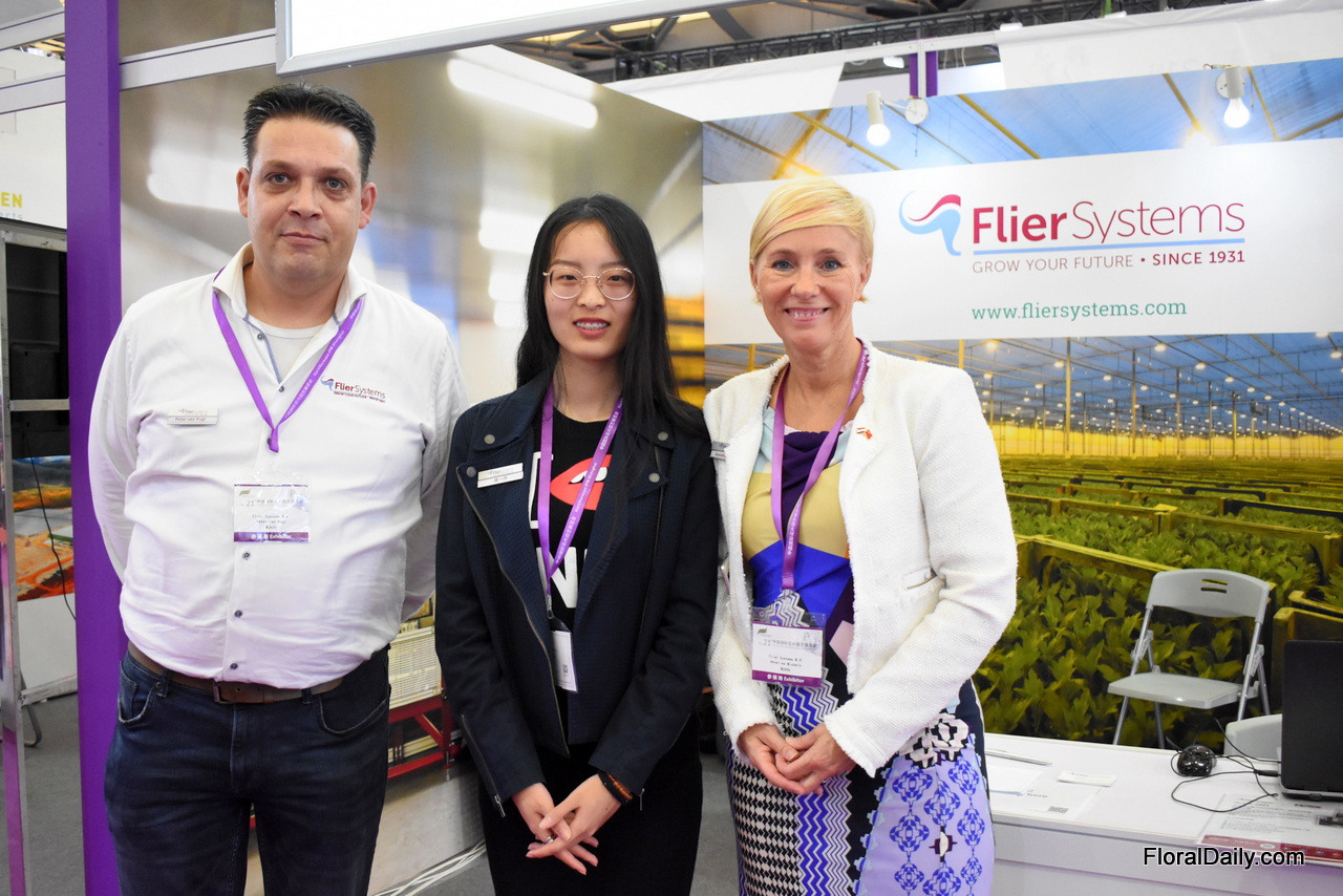 Peter van Vugt, Vanessa (interpreter) and Annelies Michels of Flier Systems. They are now nearly 4 months active on the Chinese market and they already installed a line at a chrysanthemum growers.