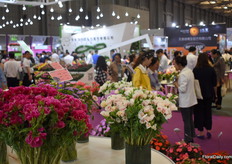 Sandra Medina of Geoflora started to export to China last year and is present at the Hortiflorexpo China for the first time. According to Medina, their new Pon Pon type and theur new Thrill series (new color, see the carnation on the right) attract a lot of attion.