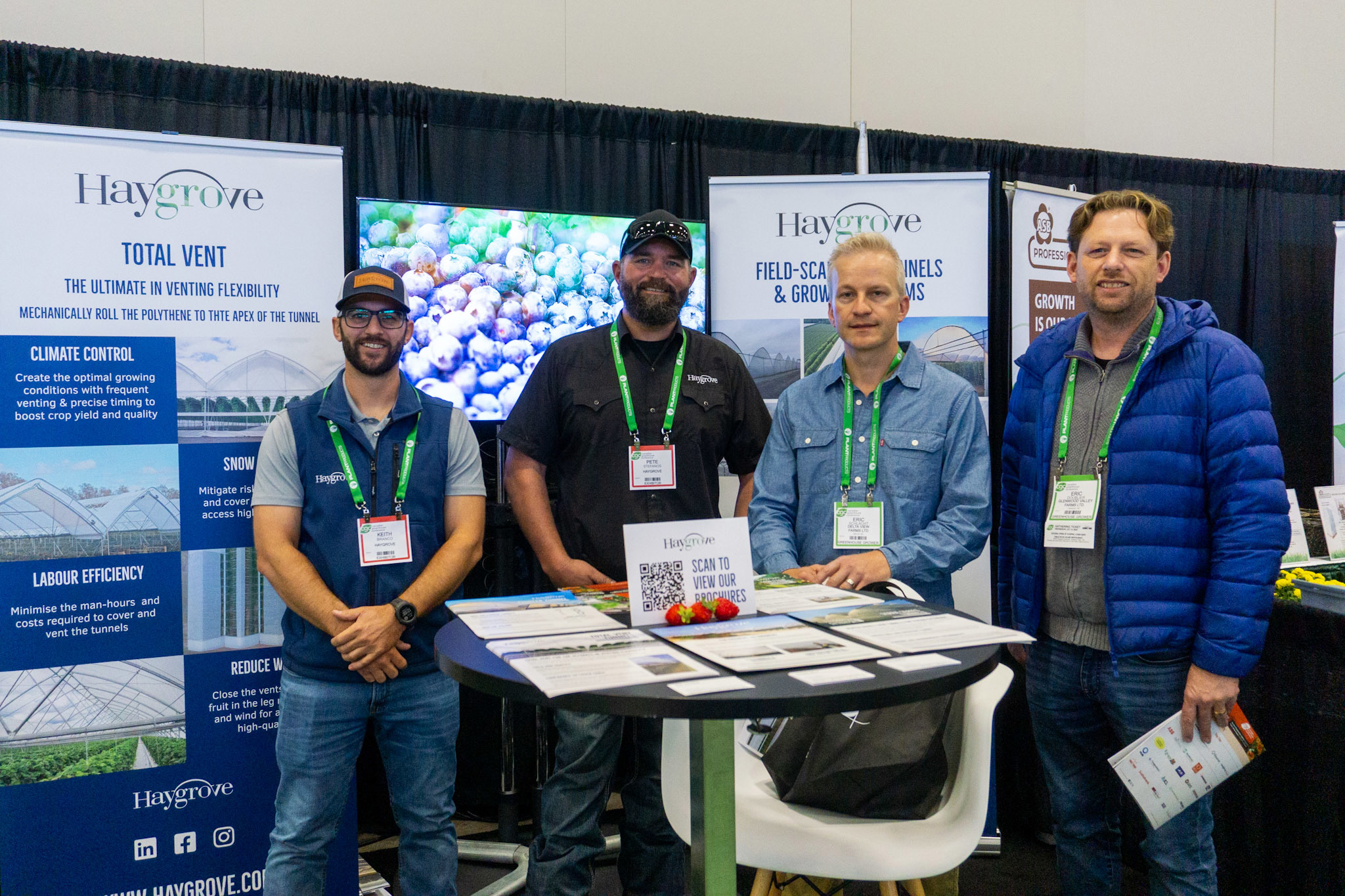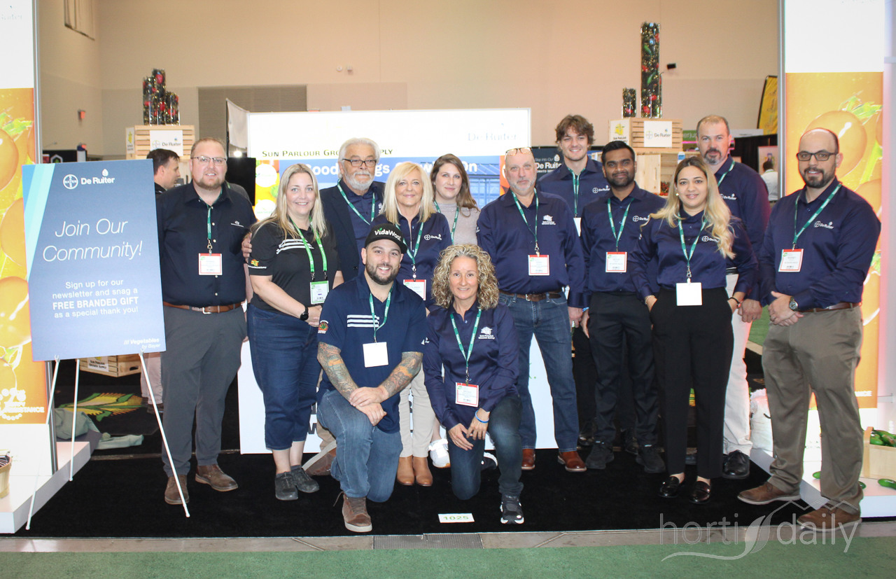 Team photo Sun Parlour Grower Supply, with the stand also featuring Bayer varieties.