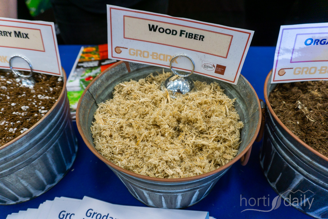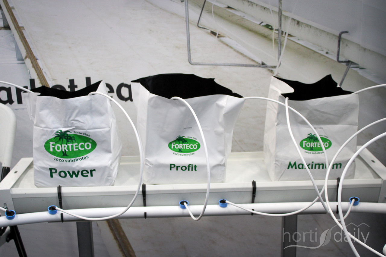 Three types of coco substrate, tailored to growers' water needs, in the stand at Van der Knaap.