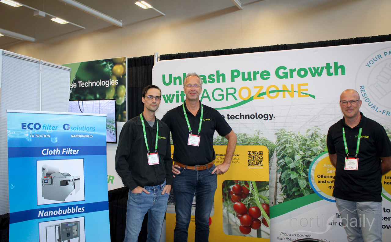 Justin Oosterveld, Cees de Haan and Werner van Mullekom at the Agrozone stand, where it is noticed that the switch from growing on rockwool to growing on coco also involves moving from UV-C disinfection to ozone disinfection of water.