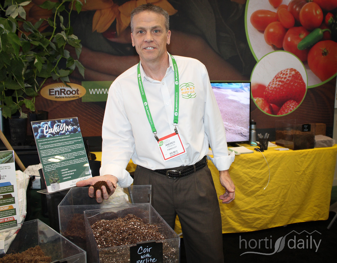 Andrew Pidgeon of Fibredust with the product CalciGro, a buffered organic coir product for organic growers.