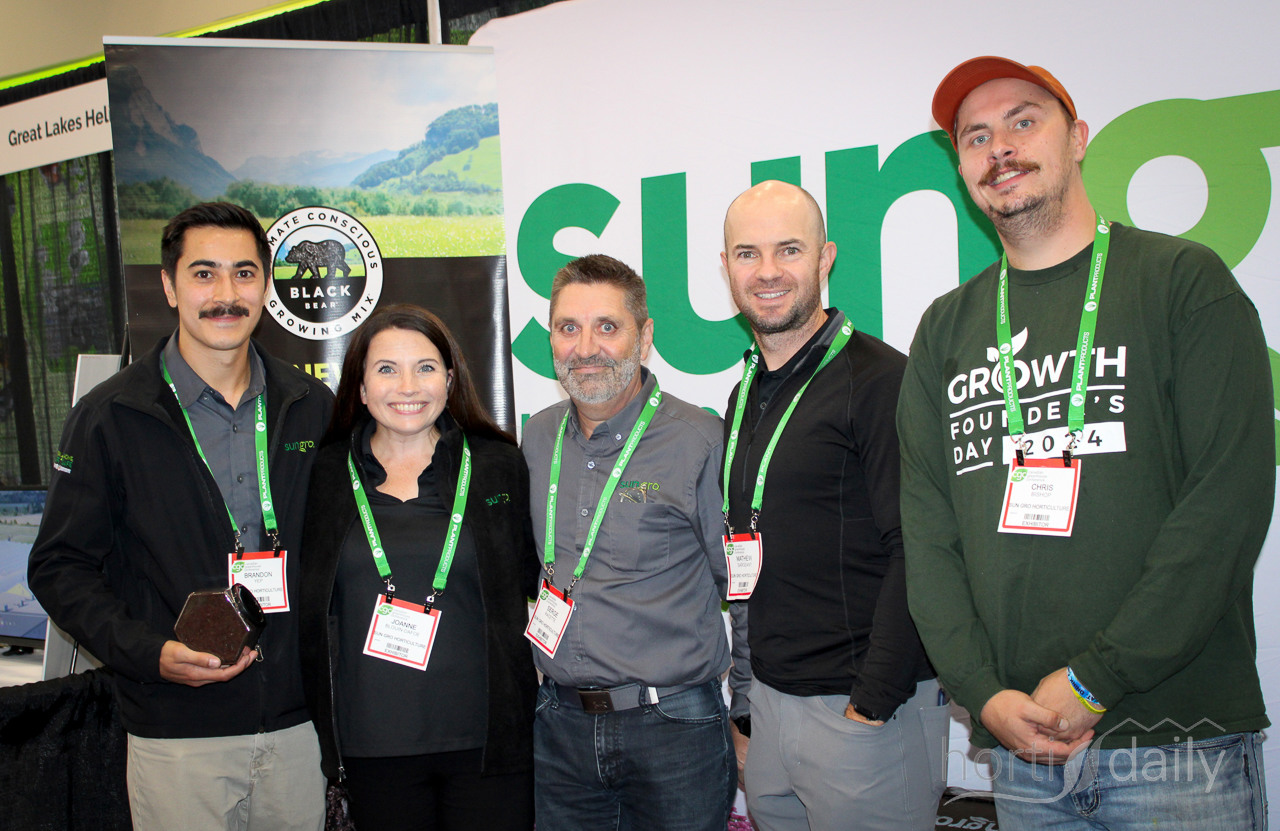 Brandon Yep, Joanne Blouin-Dafoe, Serge Racette, Matthew Sargeant and Chris Bishop of Sun Gro Horticulture with the new product Black Bear, using biochar as an alternative to perlite in substrate mixes.