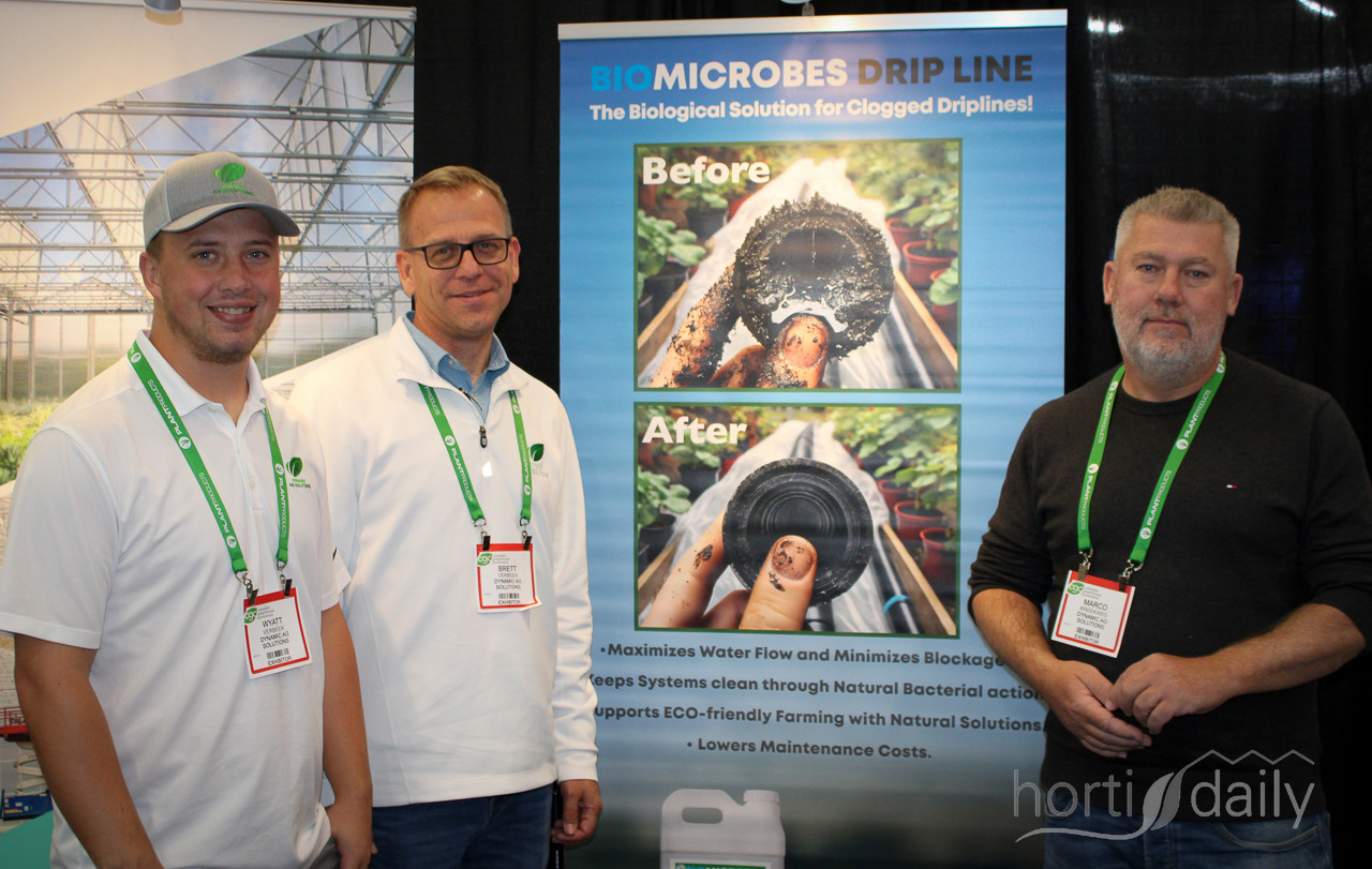 Wyatt and Brett Verbeek of Dynamic AG Solutions and Marco Breekweg of Microbac. At the fair, they showed the Bio Microbes Drip Line concept. With it, a grower realises a good, non-sticky biofilm in drip hoses to which dirt does not adhere.