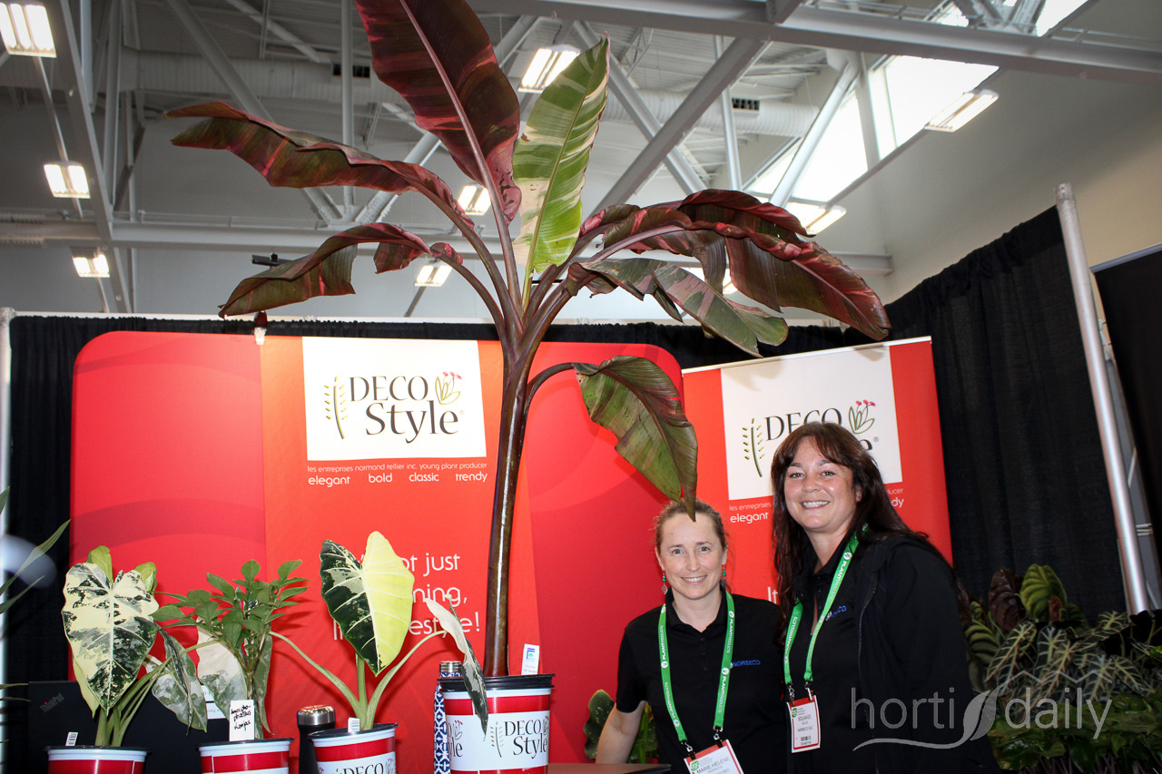 Marie-Hélène Perron and Solange Blais of Norseco who showed with the Decostyle concept that it is possible to grow tropical plants in Canada. Here a large Musa Nono Lady Diva, with pink coloured leaves.