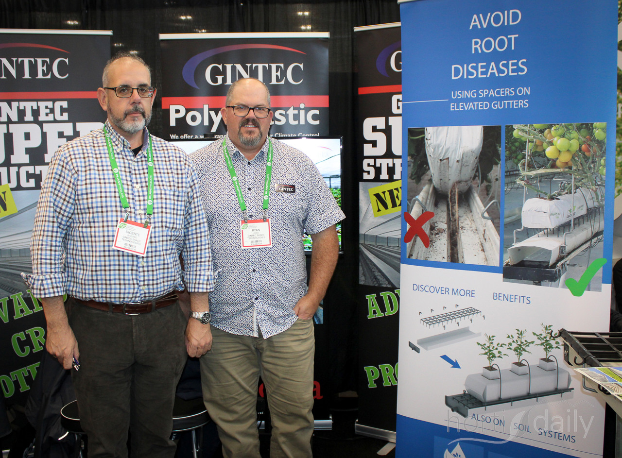 Vincente Basabe and Ryan Judd at the Gintec stand where JH Hydroponics was also present, with a spacer for retrofitting gutters to stop roots growing through the slab in the gutter.
