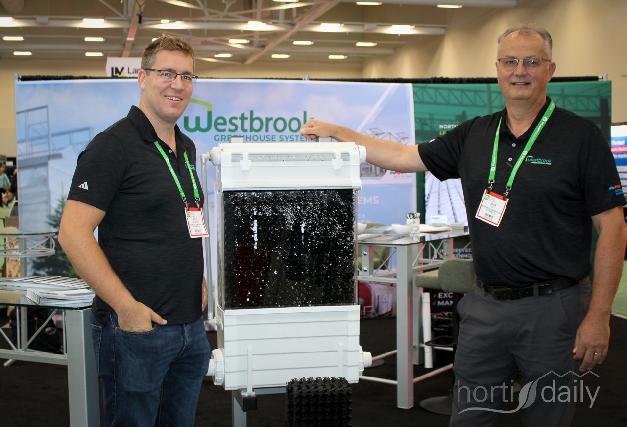 Greg van Geest and Jack Smit of Westbrook Greenhouse Systems with plastic pads for in a Pad and Fan System. Handy because the plastic lasts longer than coated cardboard and is also easier to clean.