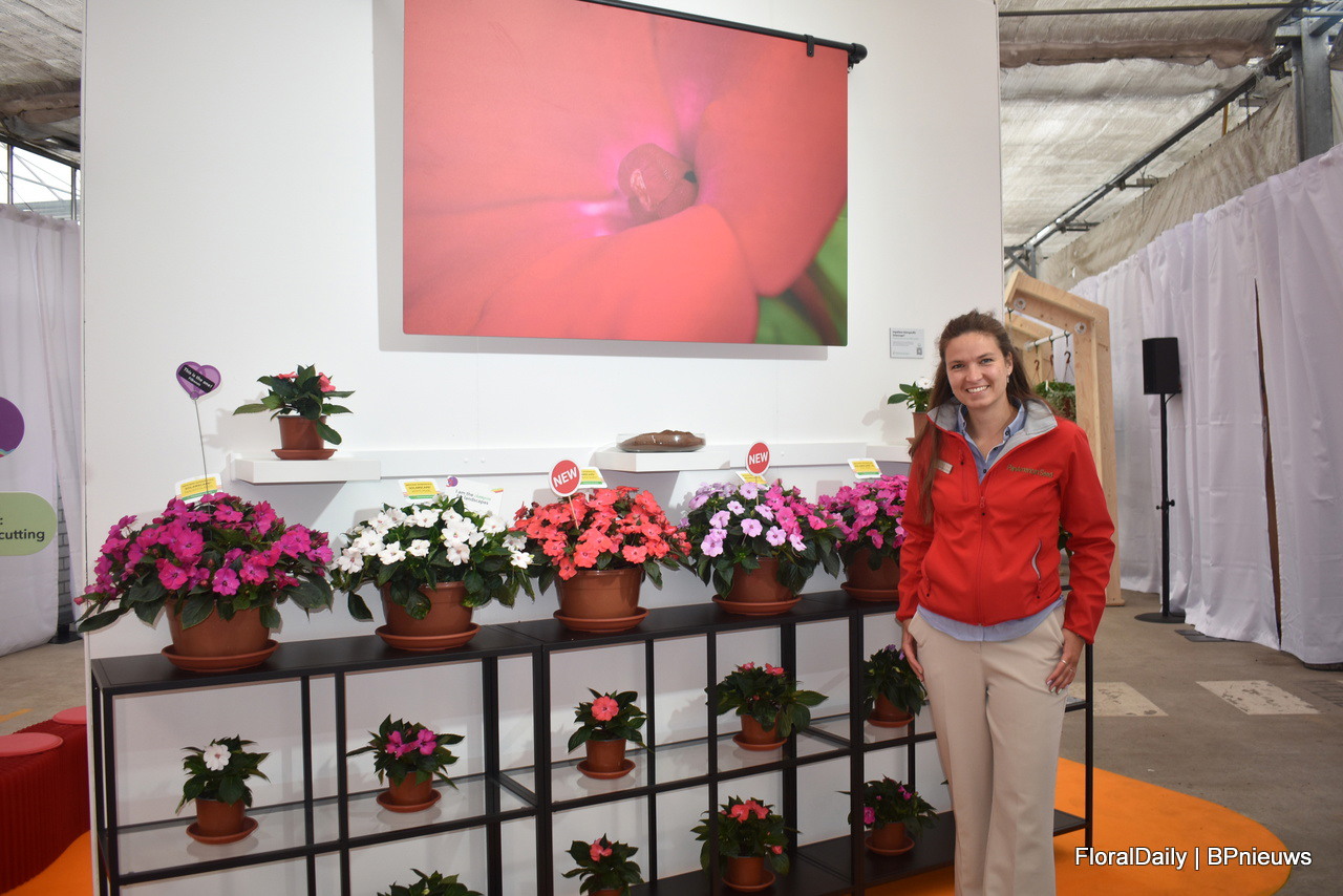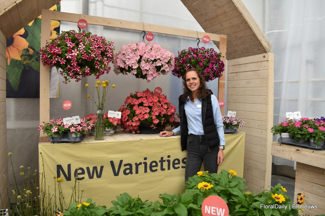 Amelie Merschmann of Benary next to the new petunia Success TR. Four new colours in the series, 2 star types and 2 Morn types