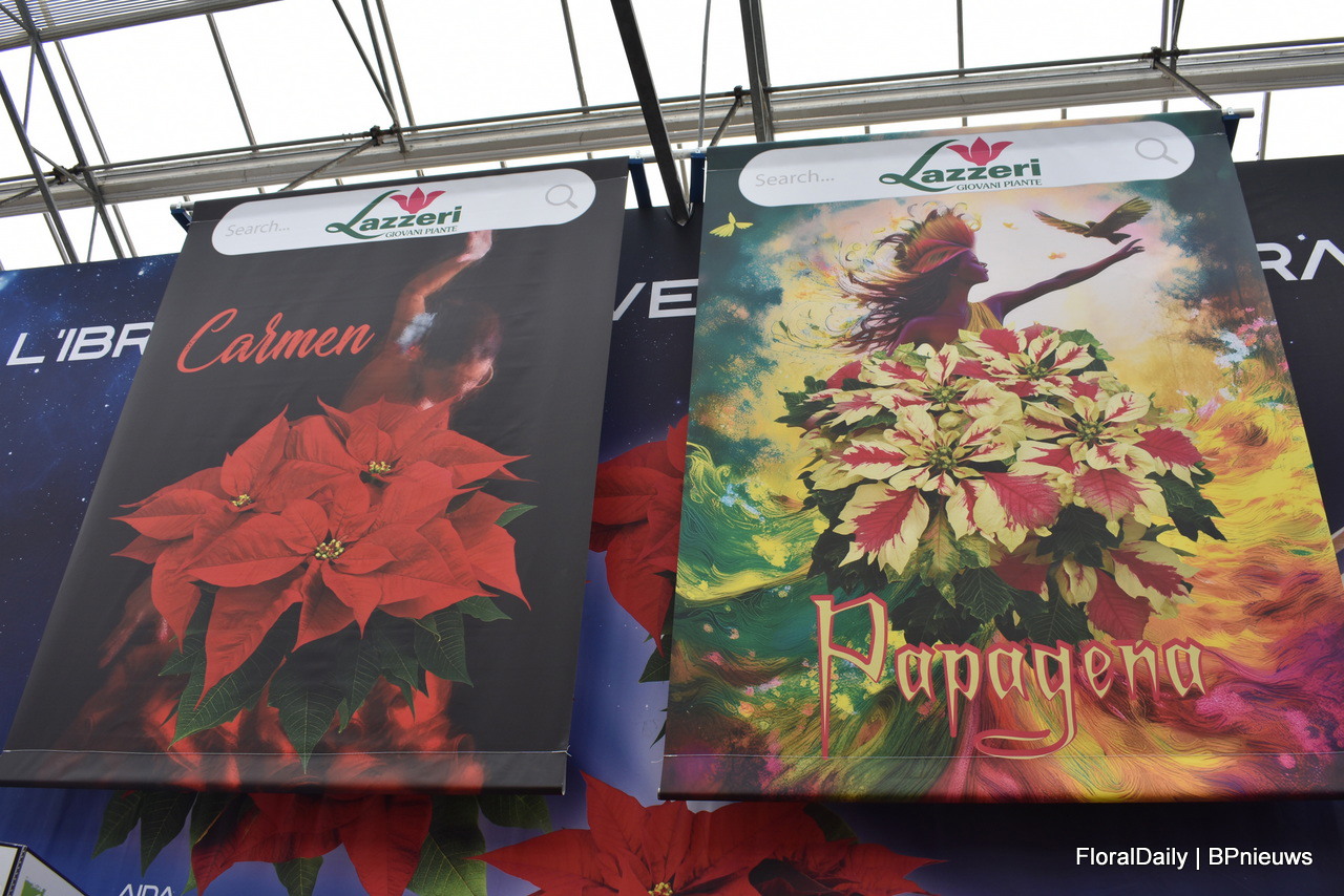 Carmen and Papagena by Lazzeri. Carmen is Lazzeri's No 1 variety in the poinsettia collection and Papagena is a new introduction for 2025.