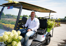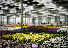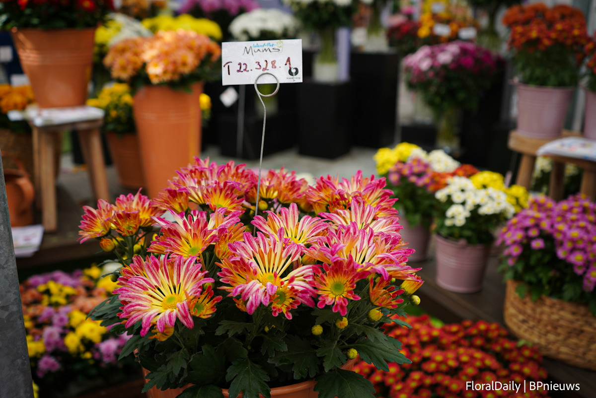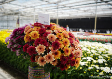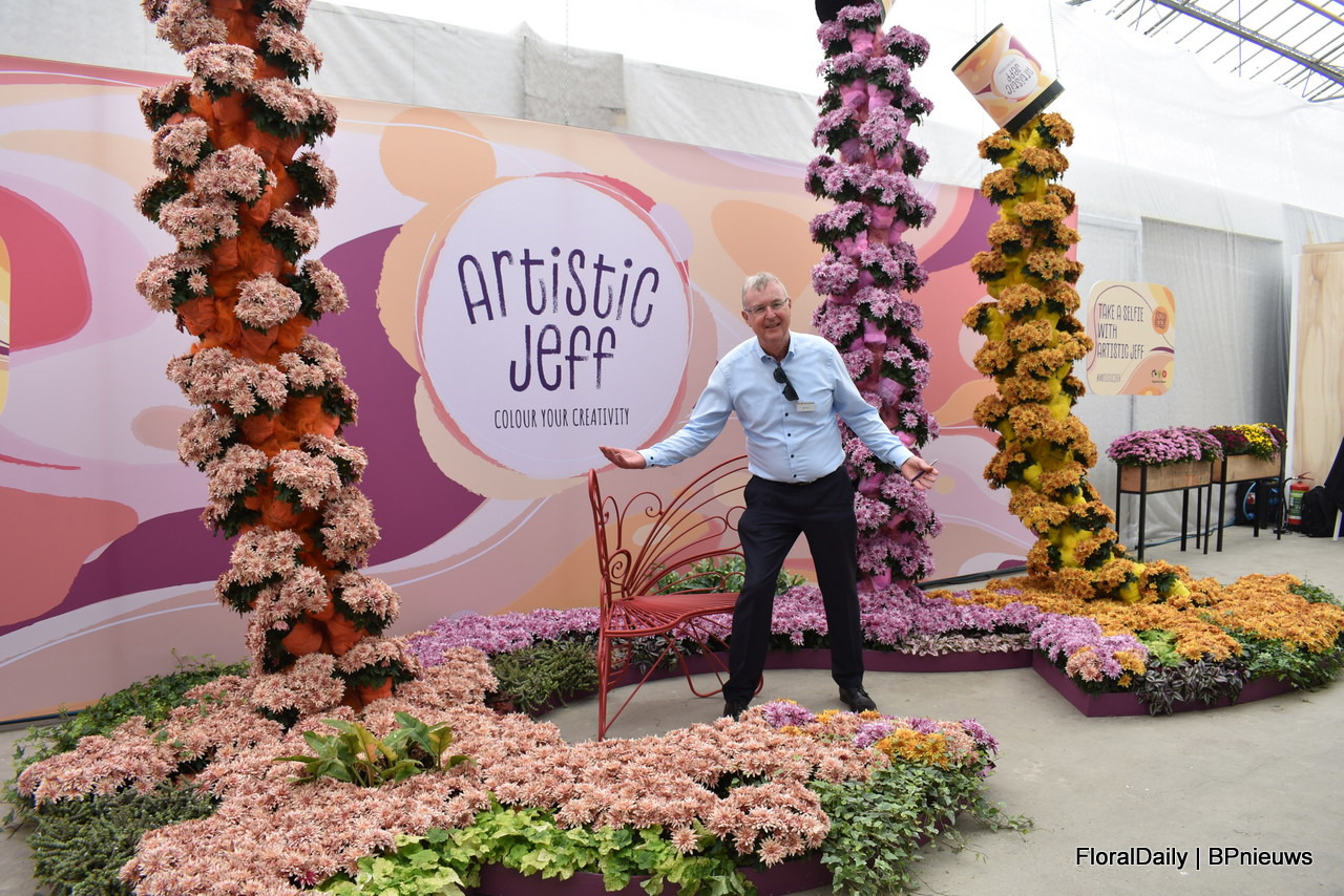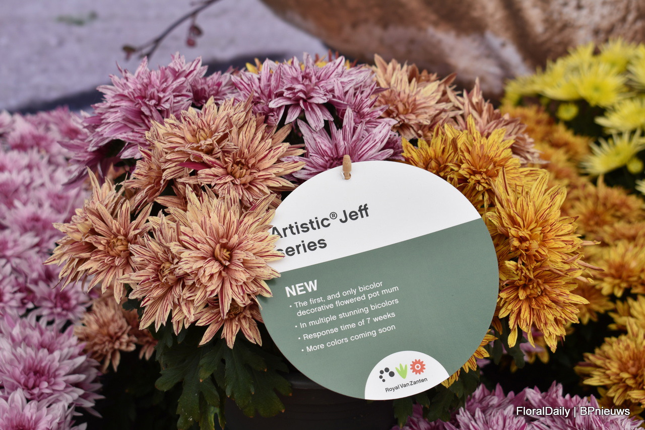 Bert Koese of Royal Van Zanten with Artistic Jeff, a potted chrysanthemum that has a bi-colored double flower. It's a true family which allows them to be mixed well.