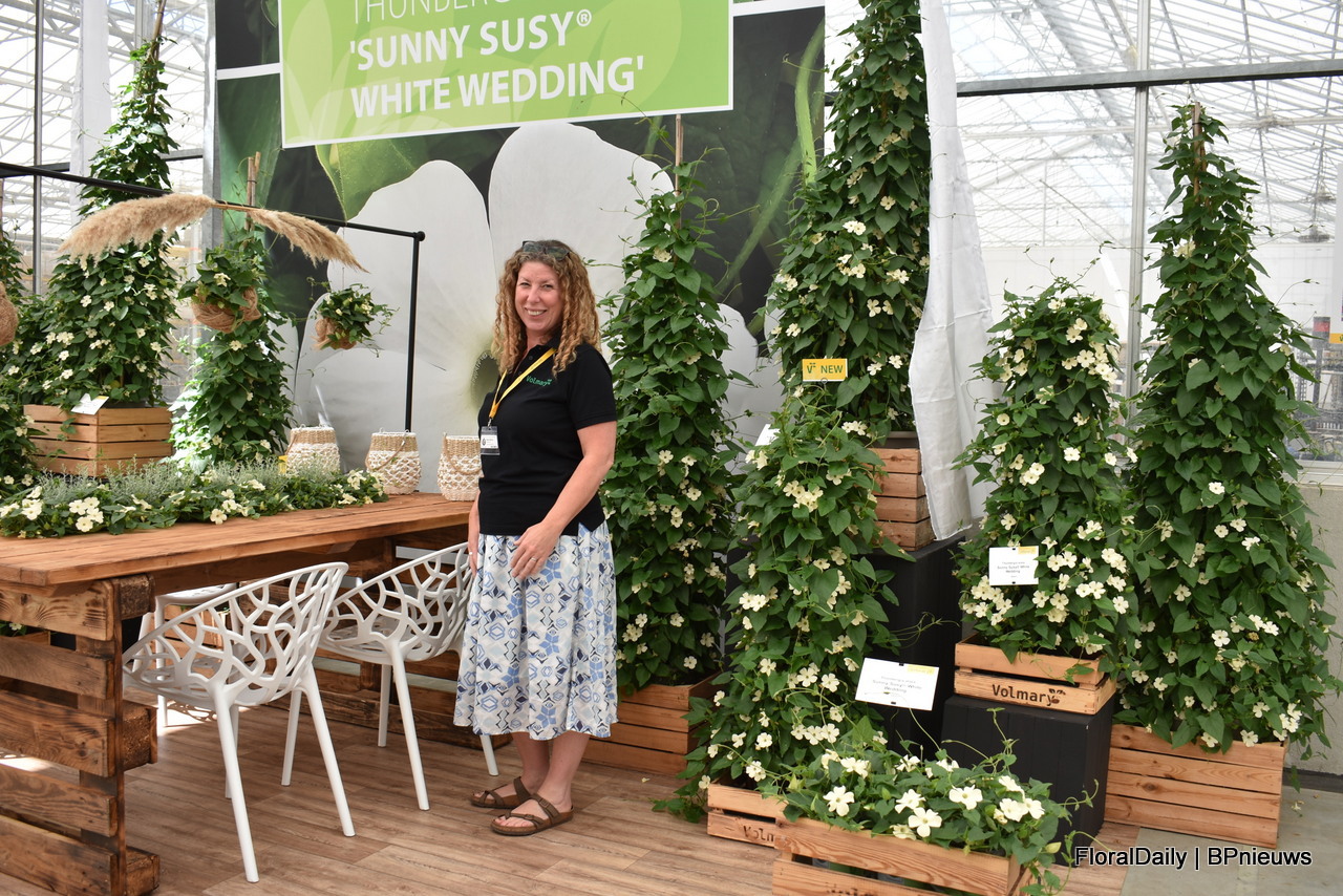 Elain Whelan of Volmary with Thunbergia White Wedding. A special feature of this variety is that it does not have a black eye, like most Thunbergias.