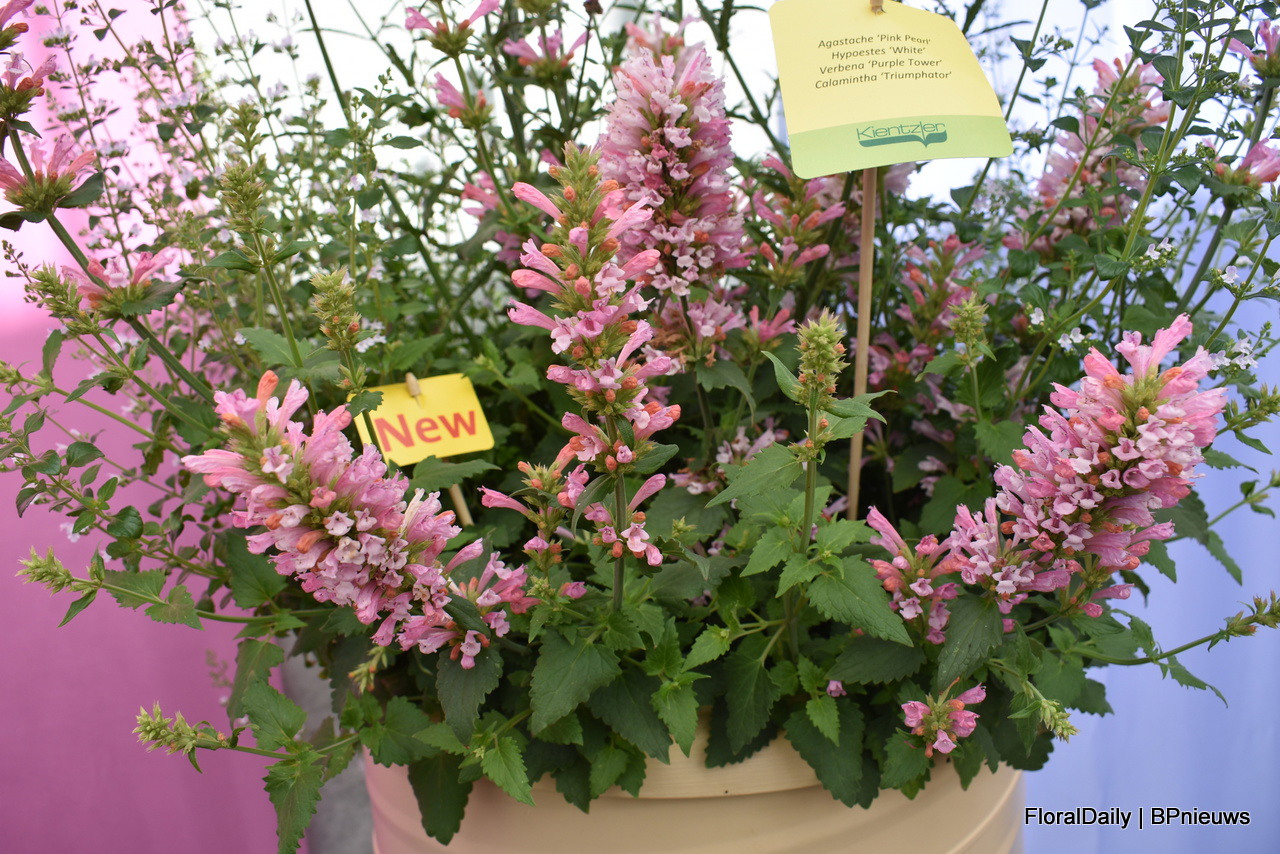 Agastache Pink Pearl by Kientzler flowers for a long time, several months and is a rebloomer, does well in small and large pots, attracts insects and is fragrant.
