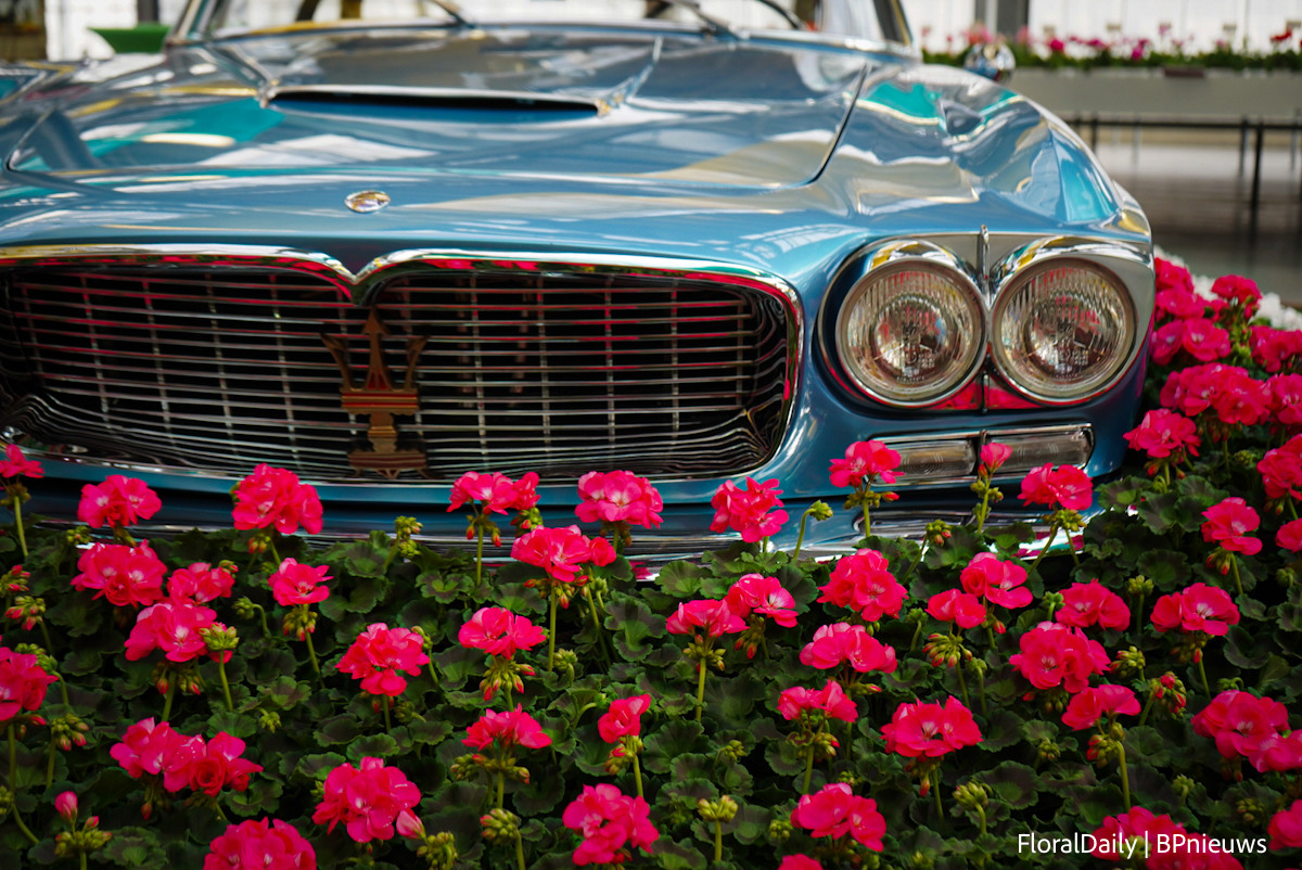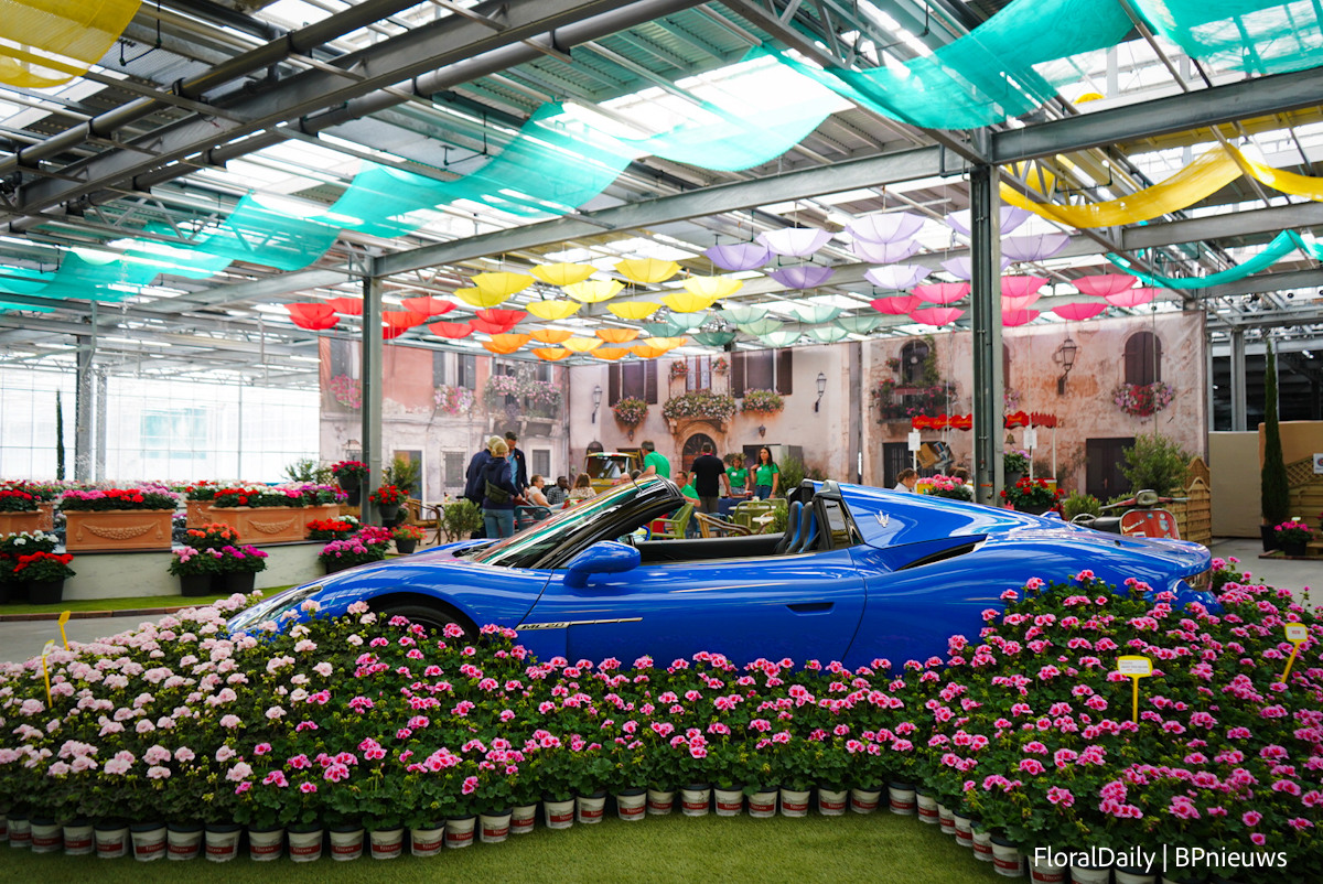 The hall was almost unrecognisable; it looked like an Italian flower festival with two Maseratis.